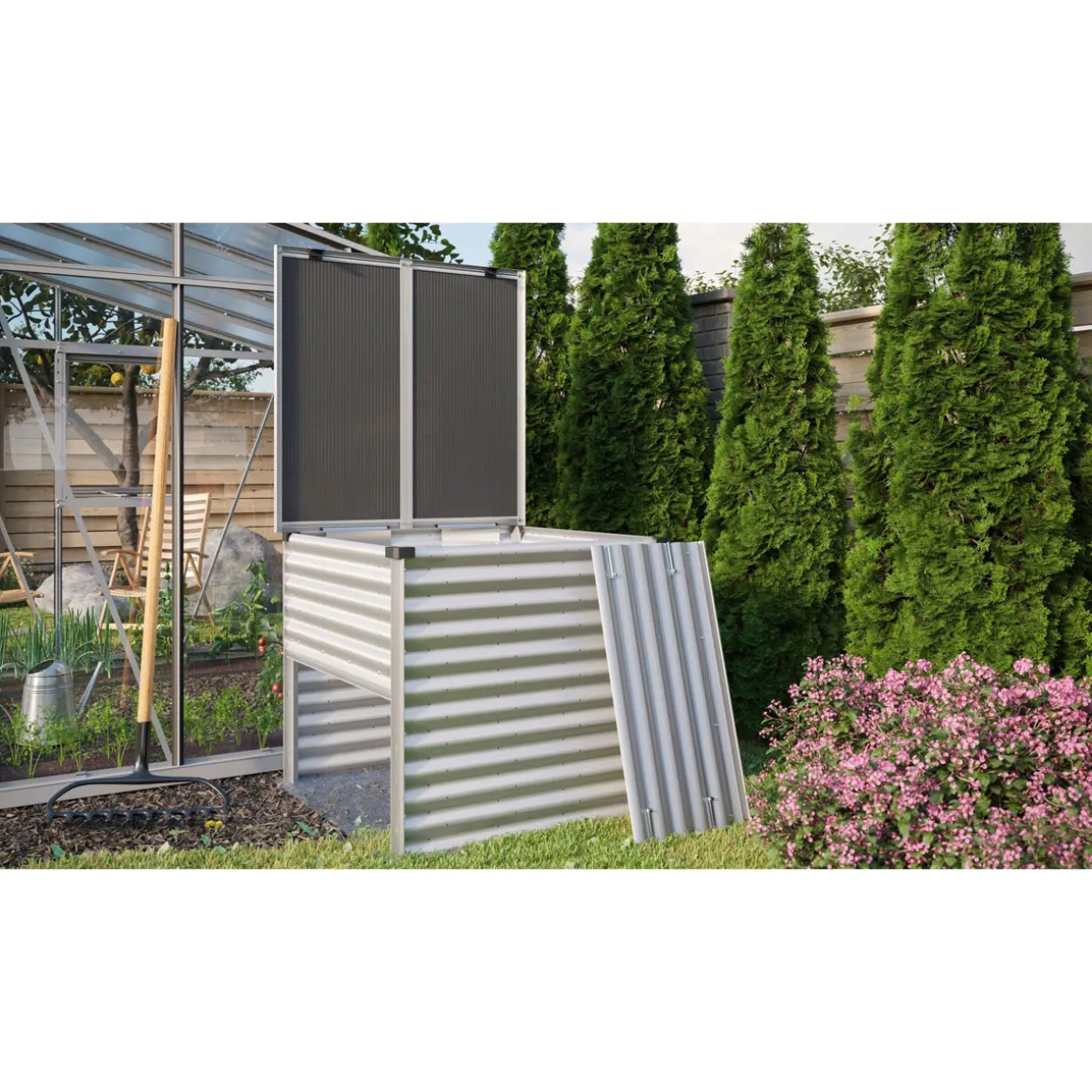 Der Vitavia Komposter Tomma überzeugt nicht nur durch sein großes Fassungsvermögen und seine robuste Bauweise aus Stahl, Aluminium und Zincalume®, sondern auch durch seine intelligente Konstruktion mit Belüftungsschlitzen und einer herausnehmbaren Seitenklappe. Durch die pulverbeschichteten Profile aus Aluminium ist er zudem extrem witterungsbeständig und vermindert Kondenswasserbildung. Der Deckel aus Polycarbonat schützt den Inhalt vor Regen und Schmutz. Mit dem Kauf des Vitavia Komposters leisten Sie einen wichtigen Beitrag zur Reduzierung von Müll im Garten.