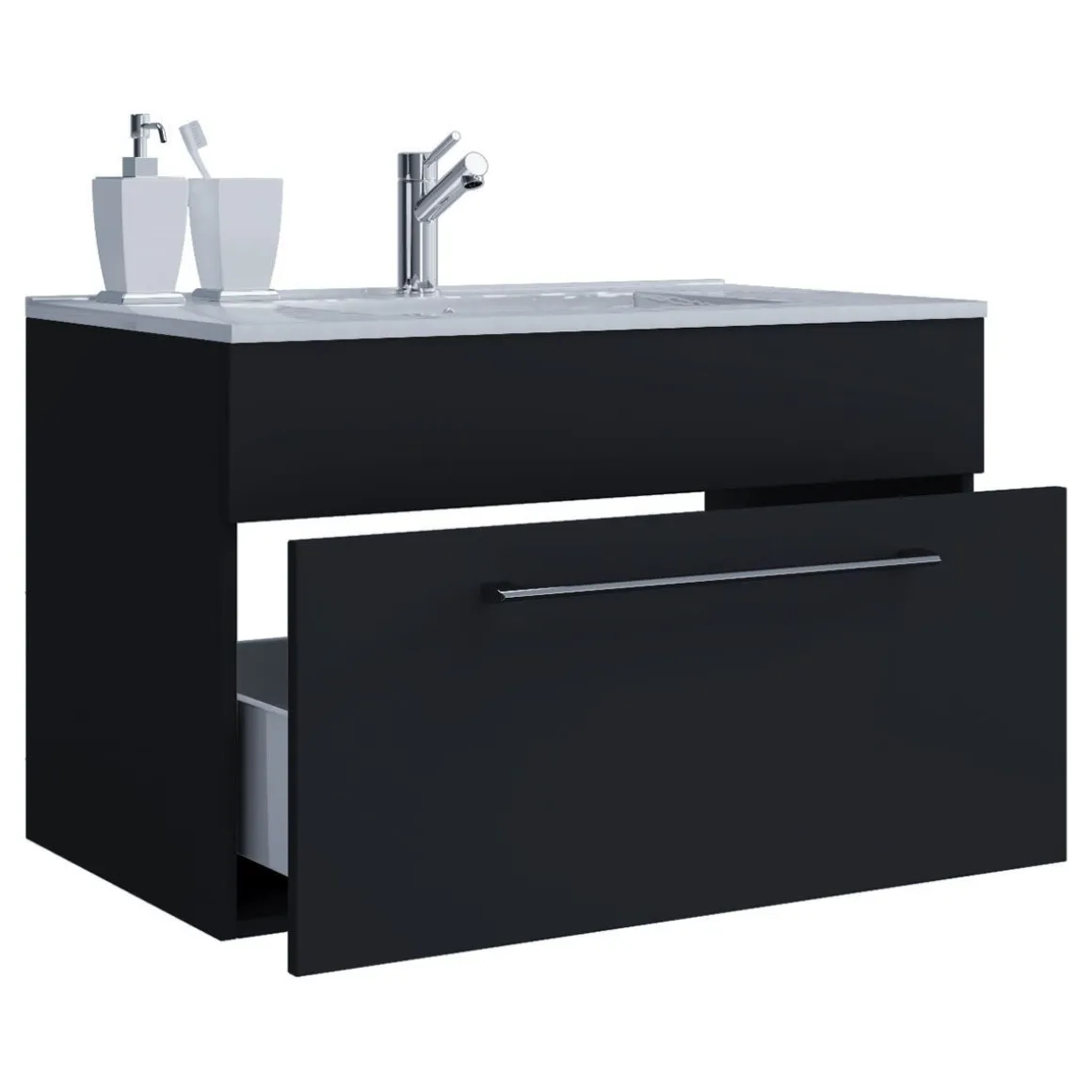 Das Badmöbel-Set besteht aus einem Unterschrank mit einer leichtgängigen Schublade mit Metallauszügen.Ein modernes Waschbecken aus massiver Keramik runden das Möbel ab, um den perfekten Blickfang im Badezimmer zu erhalten.Waschtisch-Unterschrank