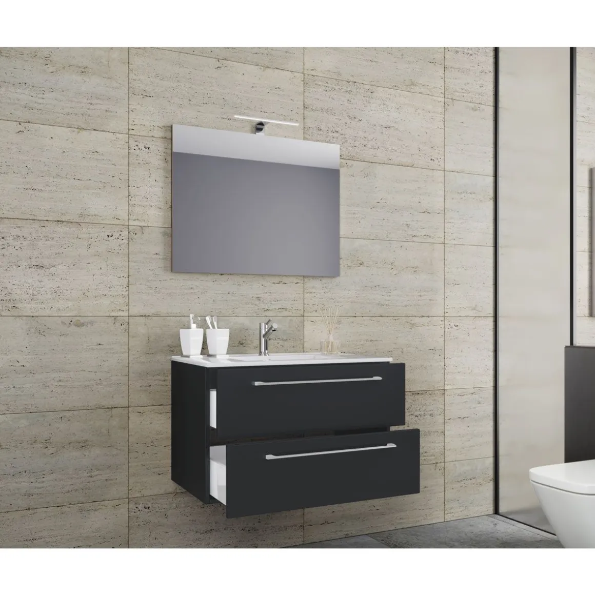 Das Badmöbel-Set besteht aus einem Unterschrank mit zwei Schubladen.Ein modernes Waschbecken aus massiver Keramik und einem Spiegel strapazierfähigem Glas runden das Möbel ab, um den perfekten Blickfang im Badezimmer zu erhalten.