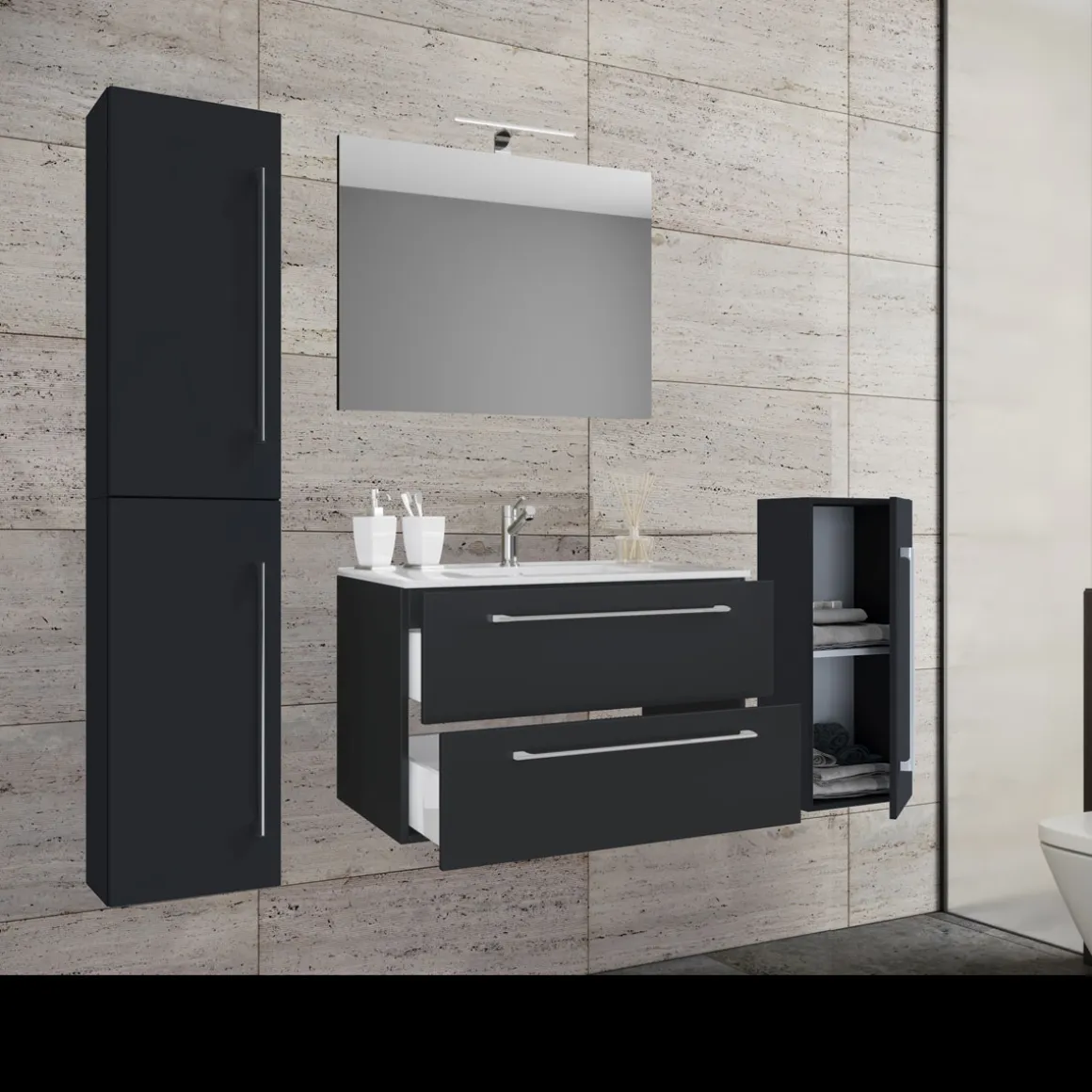 Das Badmöbel-Set besteht aus einem Unterschrank mit zwei Schubladen.Ein modernes Waschbecken aus massiver Keramik und einem Spiegel strapazierfähigem Glas runden das Möbel ab, um den perfekten Blickfang im Badezimmer zu erhalten.