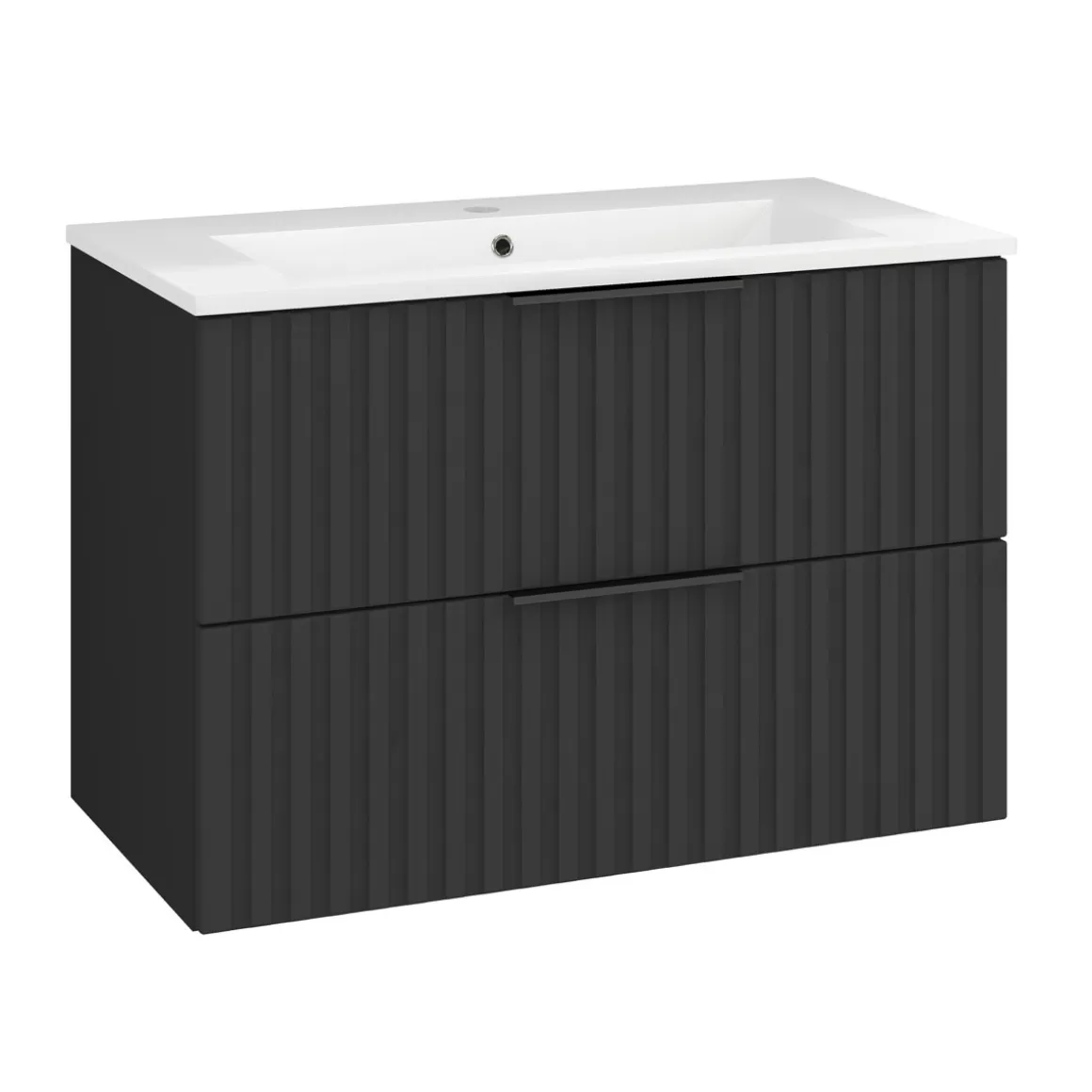 Verleihen Sie Ihrem Badezimmer einen Hauch moderner Eleganz mit dem Waschtisch „Amy 80“ in stilvollem Matt-Schwarz. Die edle MDF-Rillenfront setzt ein hochwertiges Design-Statement und ist wahlweise mit schwarzen oder chromfarbenen Griffen kombinierbar – ganz nach Ihrem Geschmack.