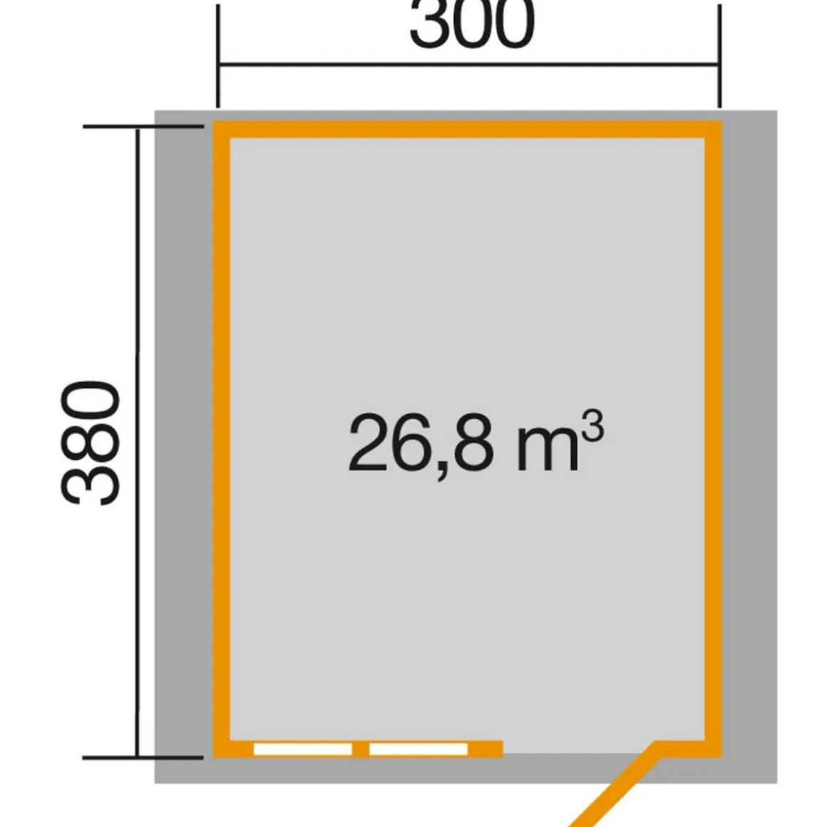 - – Außenmaße (BxLxH=Trauf) (cm): 380x410x262