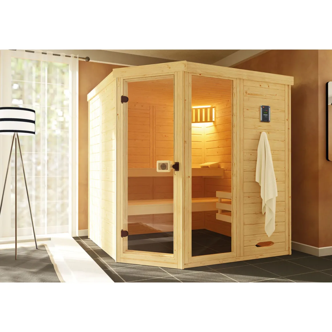 Die Weka Massivholz-Elementsauna Laukkala 3 ist ideal für alleKunden, die Wert auf Qualität und Komfort legen. Wenn Sie sich nach einer stressigen Woche einfach mal zurückziehen möchten oder einen Ort suchen, an dem Sie gemeinsam mit Familie oder Freunden entspannen können – diese Sauna erfüllt all Ihre Wünsche. Besonders praktisch: Der vormontierte Aufbau spart Zeit und Mühe! Dank des natürlichen Designs fügt sich die Sauna harmonisch in jeden Innenbereich ein. Und das Beste? Mit ihrer hochwertigen Verarbeitung bleibt sie über Jahre hinweg ein verlässlicher Begleiter Ihrer Wellness-Routine.