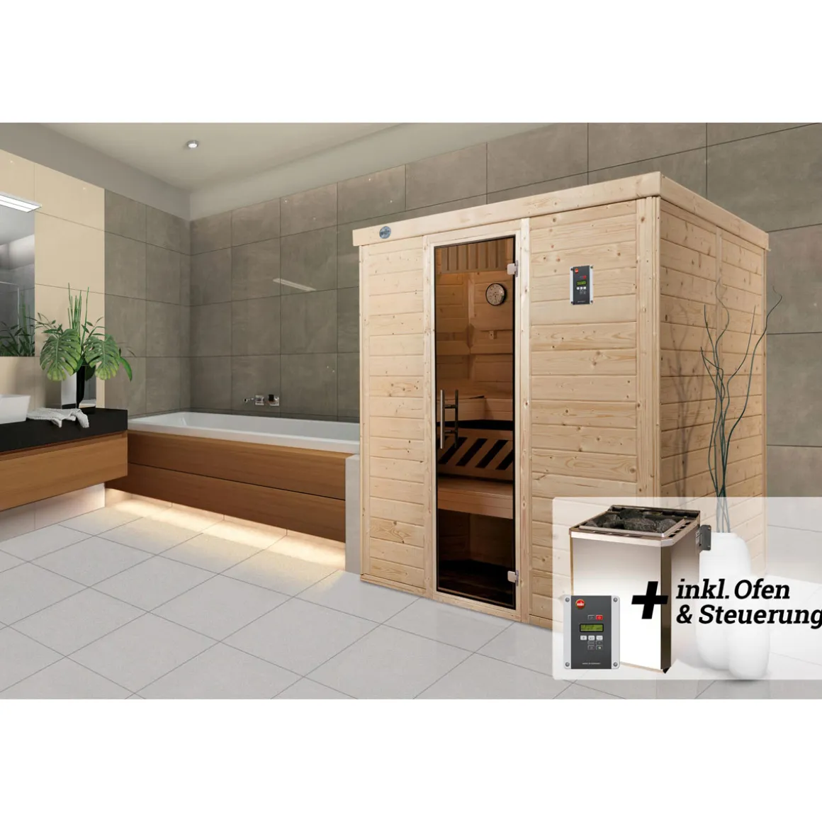 - Inklusive leistungsstarkem 7,5 kW Bio-Ofen mit externer Steuerung für eine schnelle Aufheizzeit