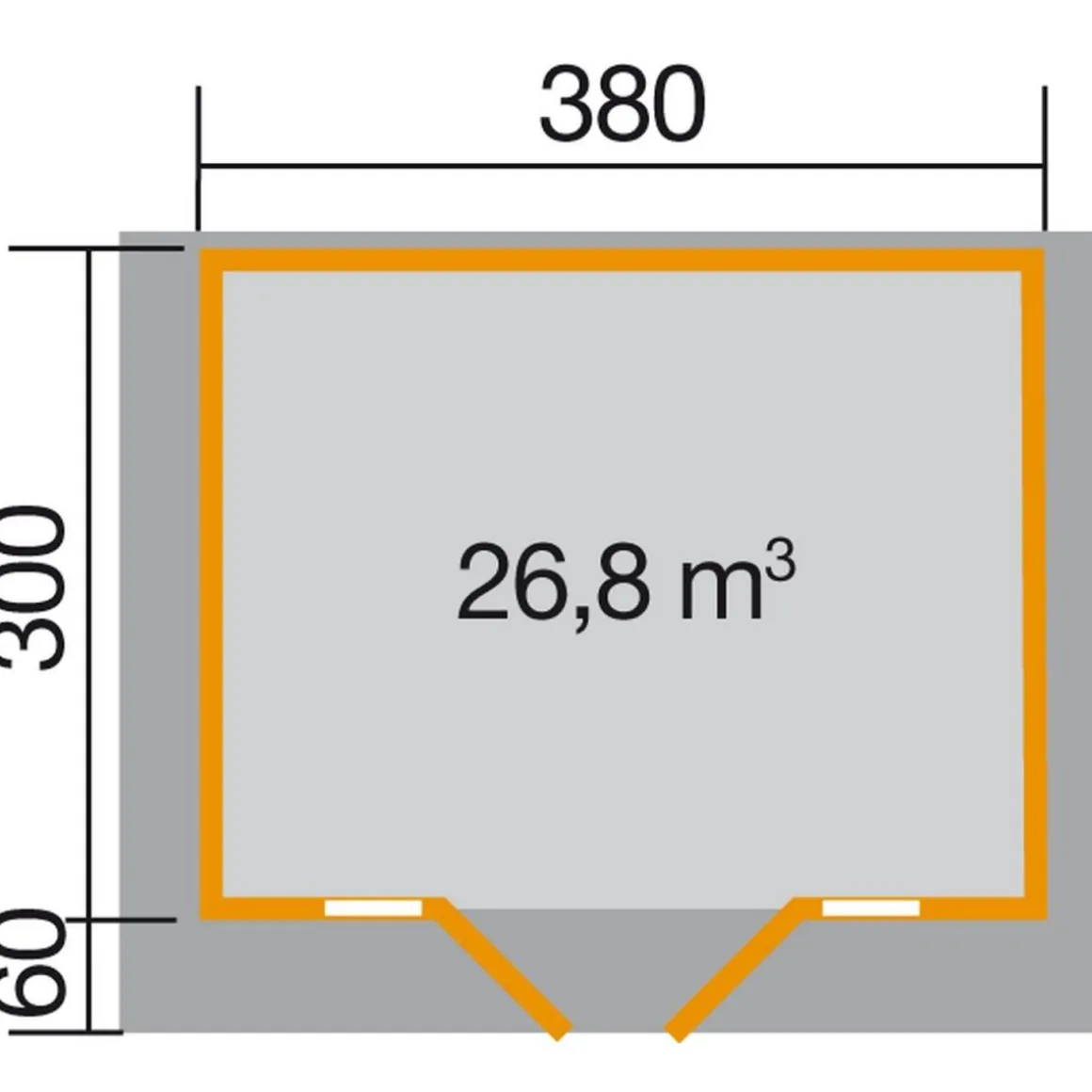 - Außenmaß (BxLxH=Trauf) (cm): 380x300x262