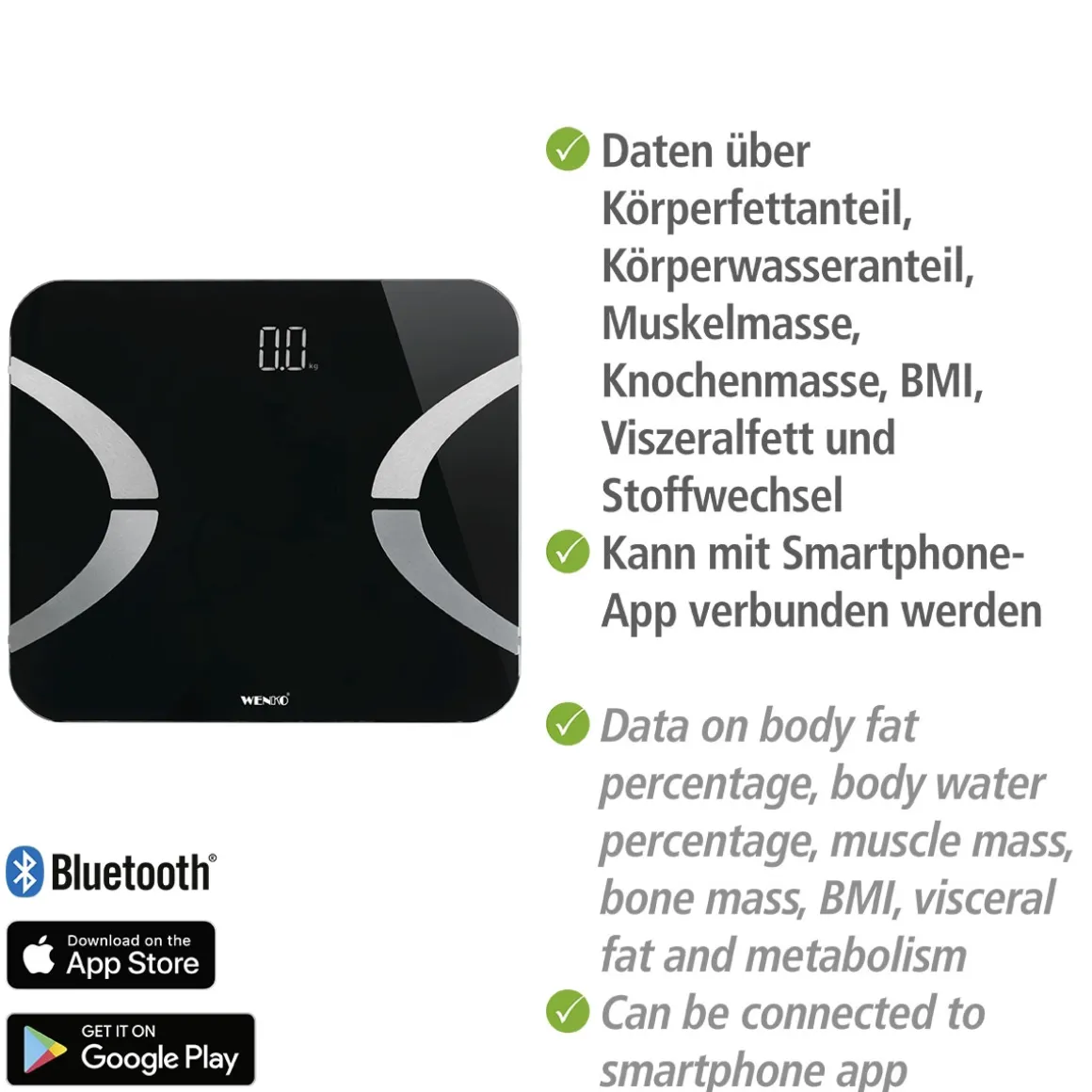 Die Wenko Analysewaage ist die perfekte Wahl für alle, die ihre Gesundheit im Blick behalten möchten. Mit der praktischen Bluetooth-Funktion und der modernen LED-Anzeige wird das Wiegen zum Erlebnis.