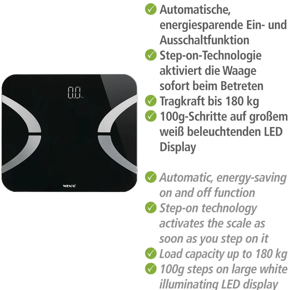 Die Wenko Analysewaage überzeugt durch ihr modernes Design und viele nützliche Funktionen wie Bluetooth-Konnektivität und LED-Anzeige. Die maximale Belastbarkeit von 180 kg macht sie zu einer robusten Wahl für jedermann. Mit dieser Waage können Sie Ihre Fortschritte auf dem Weg zu einem gesünderen Lebensstil verfolgen.