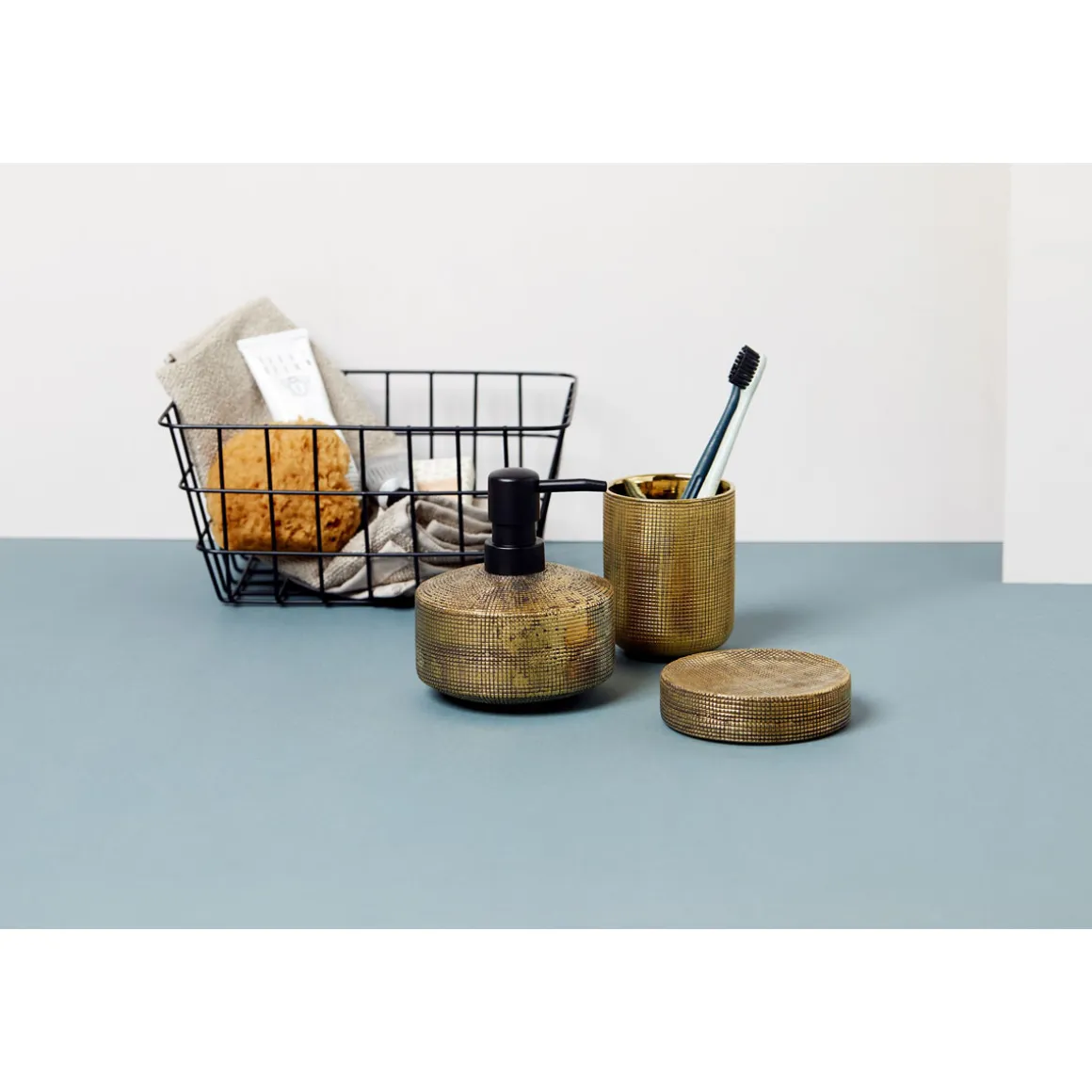 - Inhalt: WC-Garnitur, WC-Bürste, Seifenspender, Zahnputzbecher