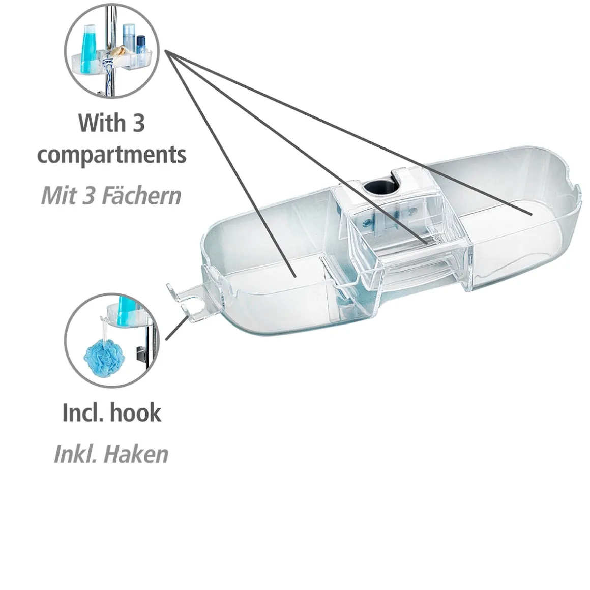 Mit dem Wenko Duschstangencaddy Premium wird die tägliche Duschroutine zum Erlebnis. Der transparente Caddy aus Polystyrol bietet mit seinen drei Fächern ausreichend Platz für Shampoo, Duschgel und weitere Pflegeprodukte. Die Montage ist kinderleicht und der Caddy passt auf alle gängigen Duschstangen.