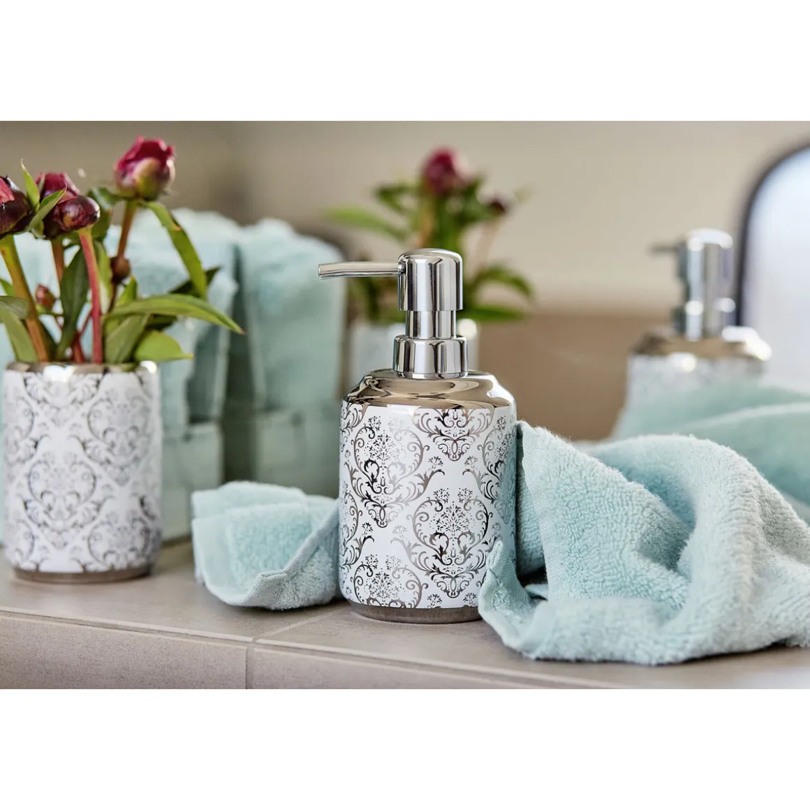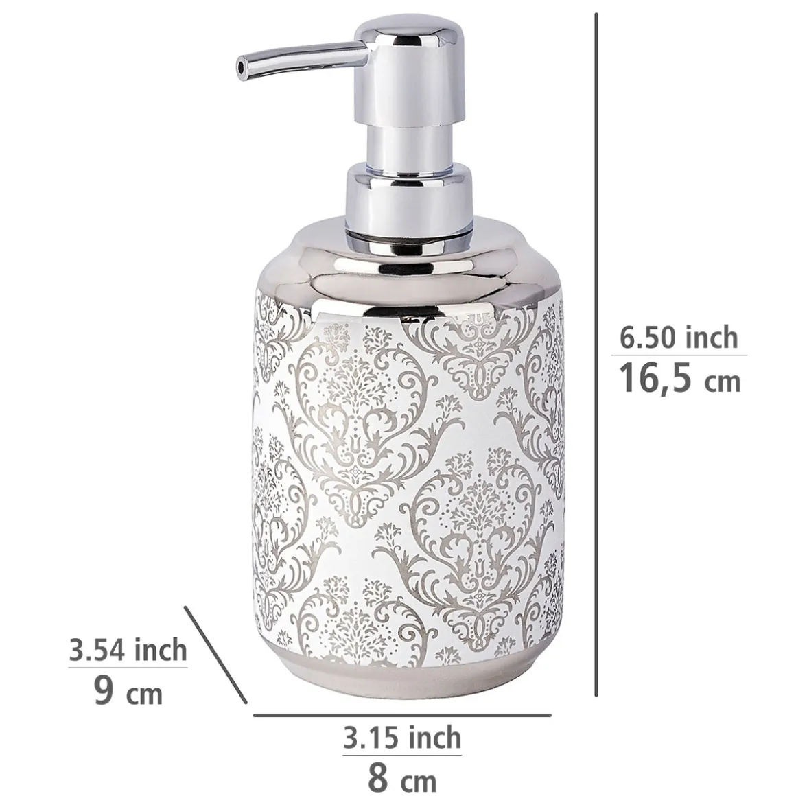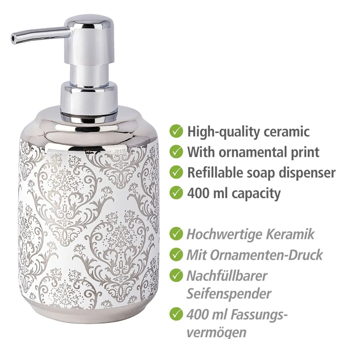 Mit dem Wenko Seifenspender Barock holen Sie sich ein Stück Eleganz in Ihr Badezimmer. Das stilvolle Design mit silbernen Ornamenten und der runden Form machen ihn zu einem echten Hingucker.