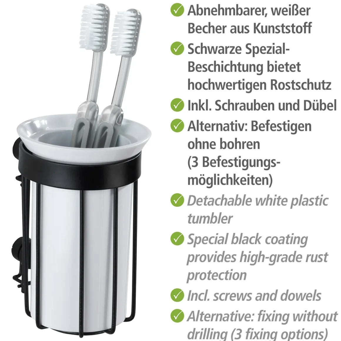 - – Lieferumfang: Zahnputzbecher im Gestell, Schrauben und Dübel