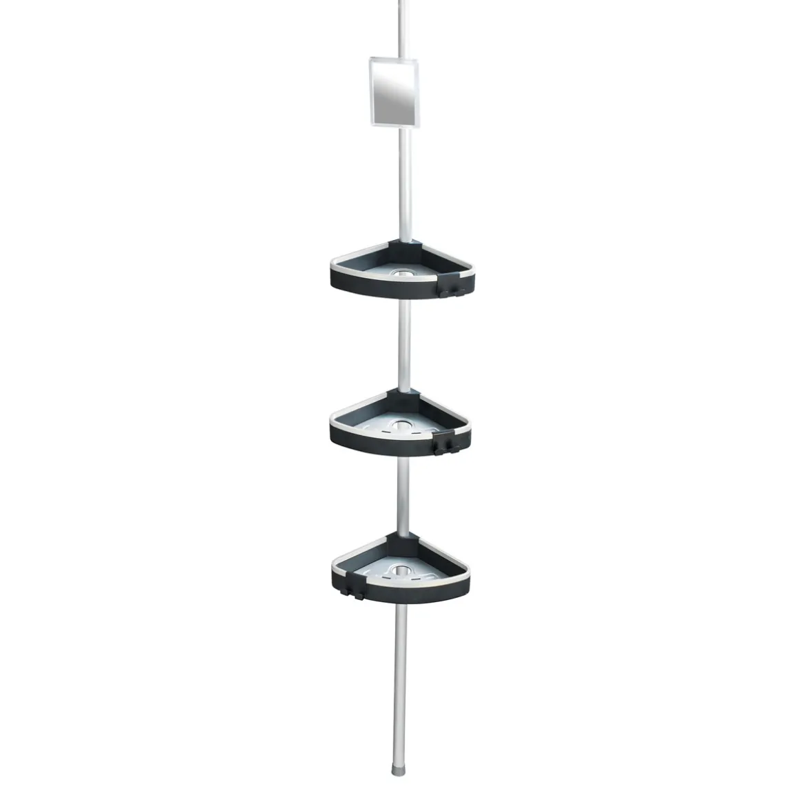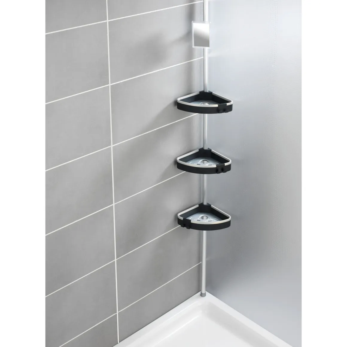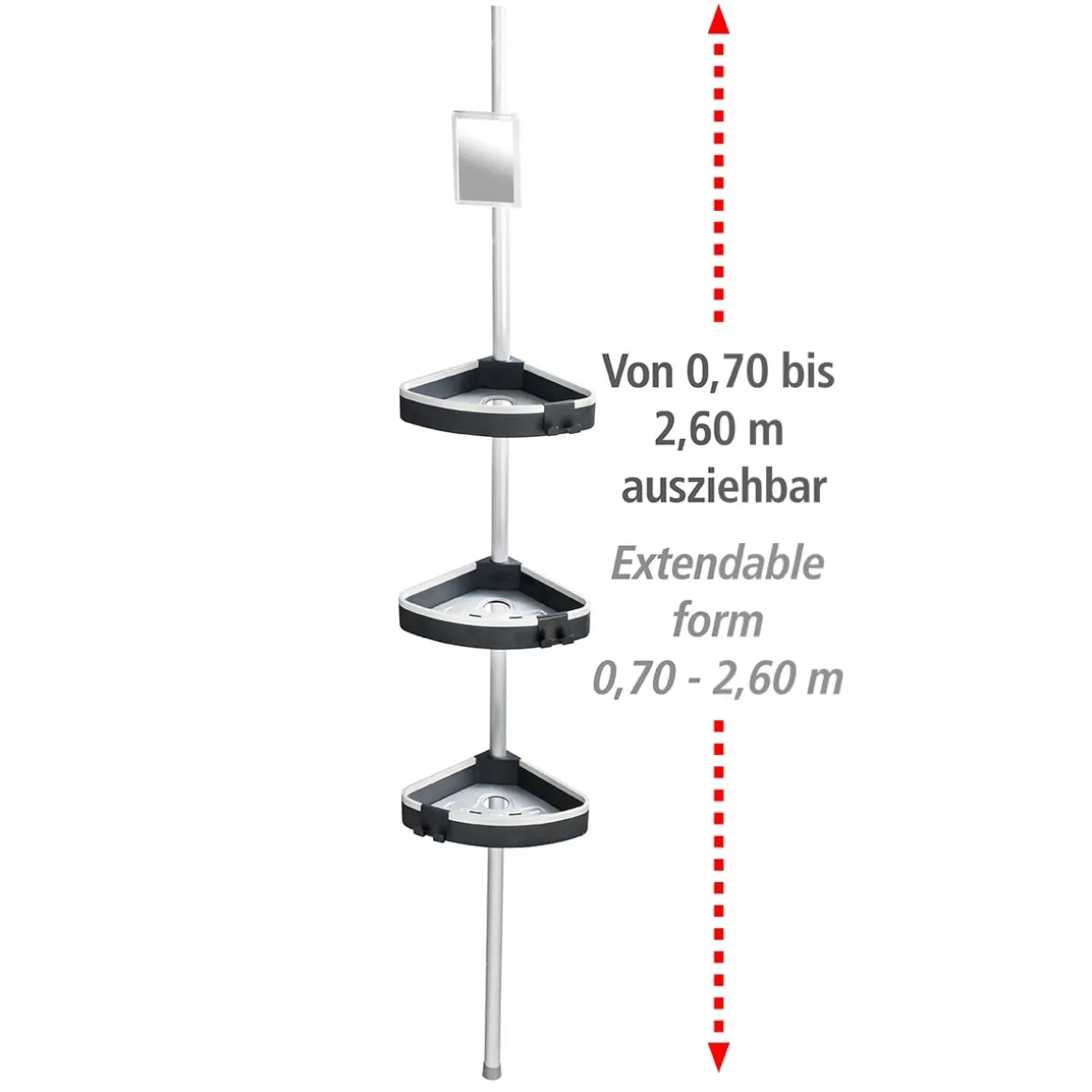 - Lieferumfang: Teleskopstange, 3 Ablagen inkl. Haken, 1 Antibeschlag-Spiegel