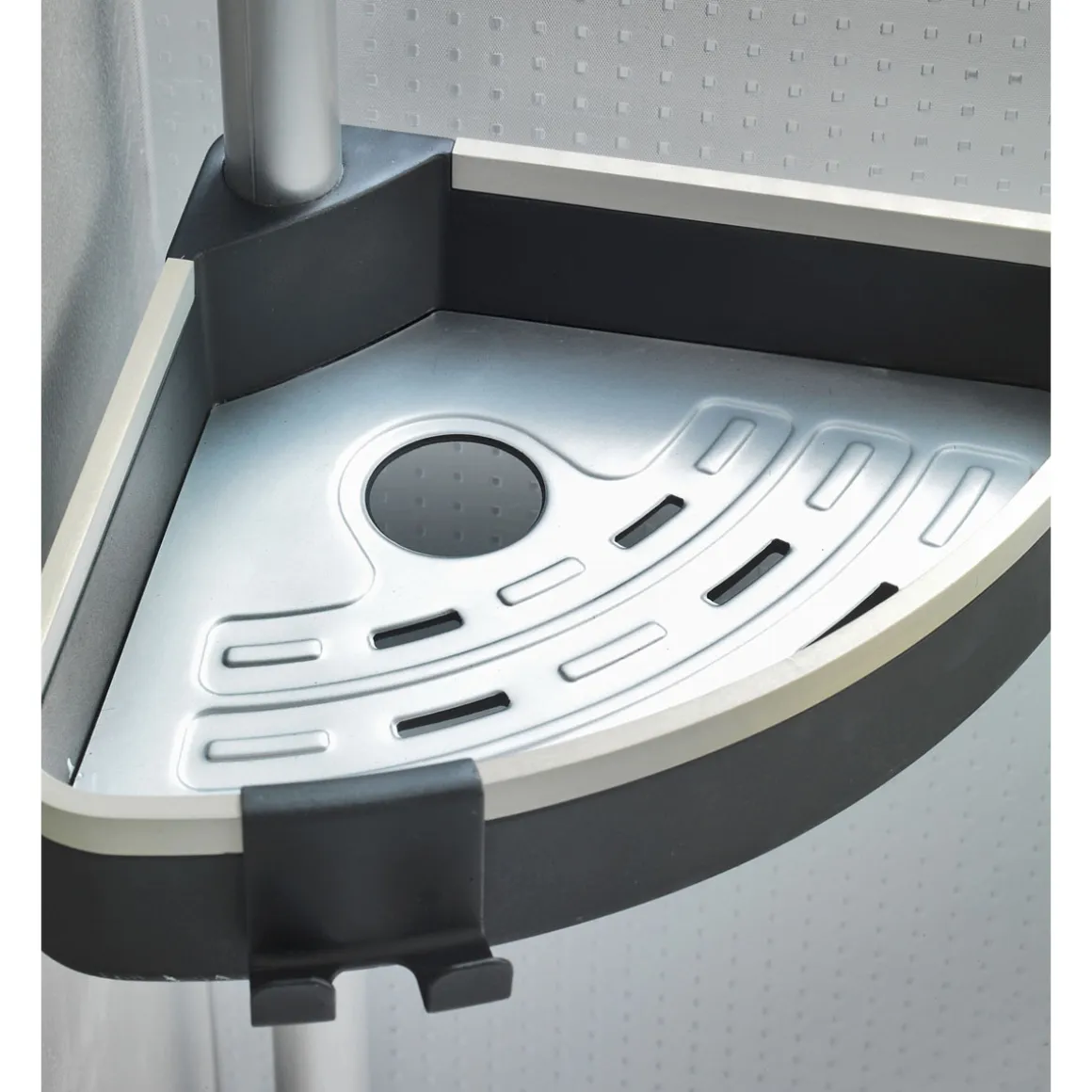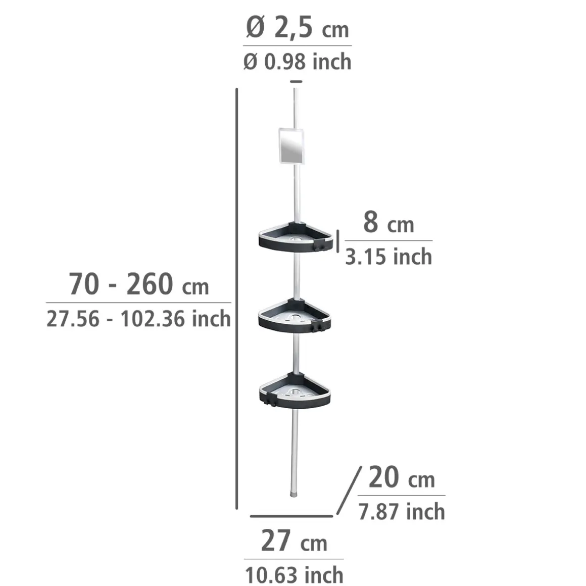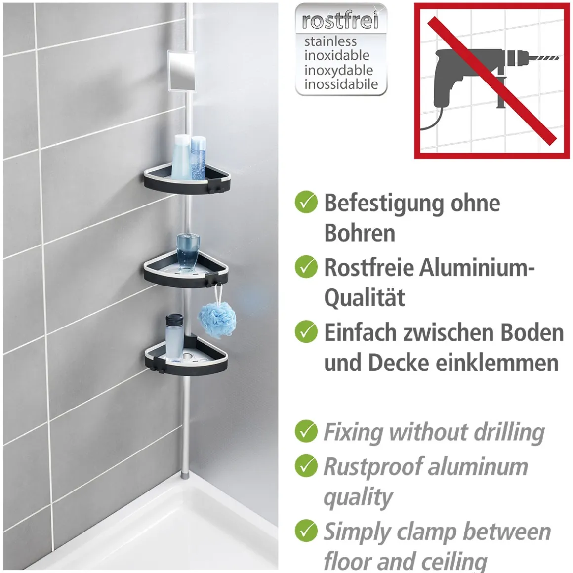 - Lieferumfang: Teleskopstange, 3 Ablagen inkl. Haken, 1 Antibeschlag-Spiegel