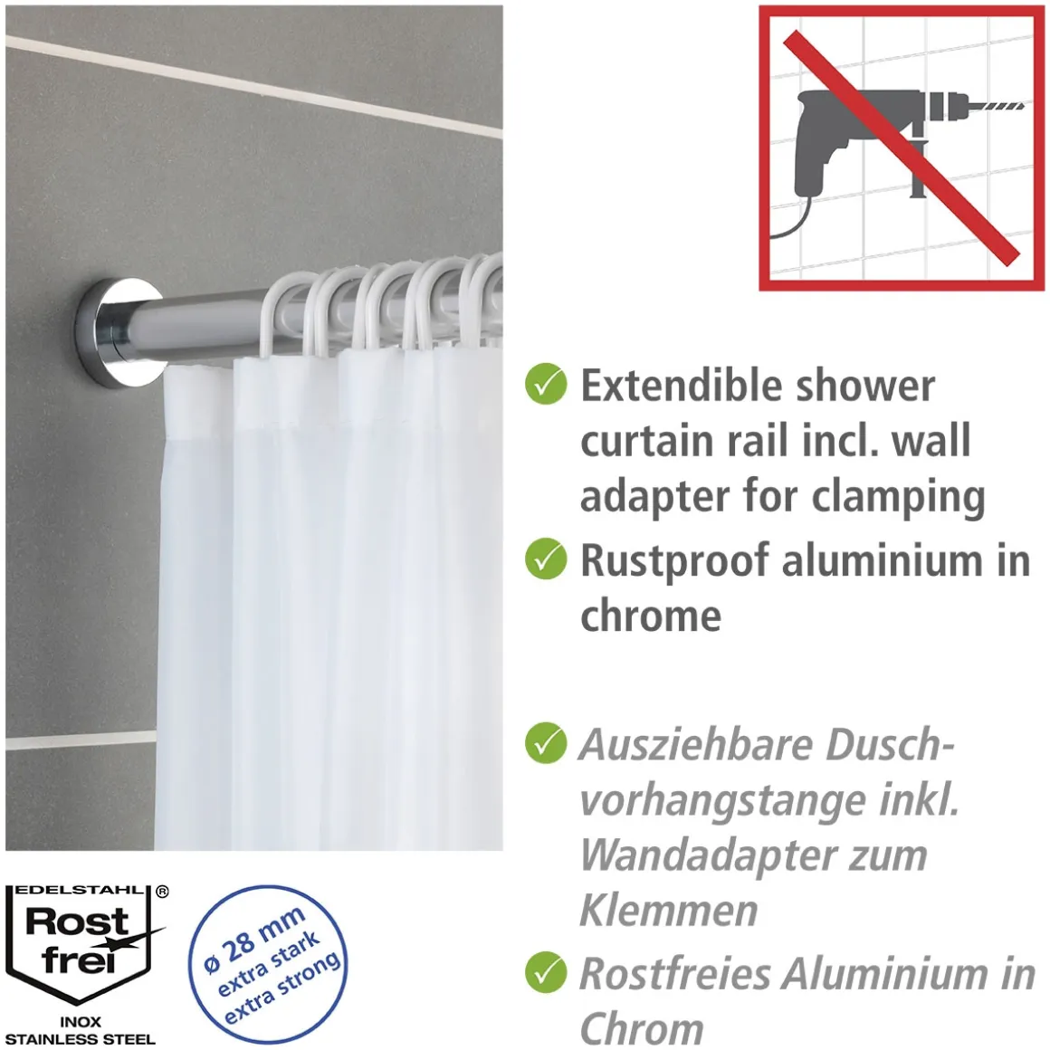 Mit der Wenko Teleskop-Duschstange Luz erhalten Sie eine hochwertige und langlebige Duschvorhangstange, die sich einfach montieren lässt. Dank der ausziehbaren Funktion passt sie in nahezu jedes Badezimmer und bietet Ihnen maximale Flexibilität beim Aufhängen Ihres Duschvorhangs. Zudem besteht sie aus rostfreiem Edelstahl mit glänzender Beschichtung, was nicht nur optisch ansprechend aussieht, sondern auch dafür sorgt, dass sie lange Zeit wie neu aussieht.
