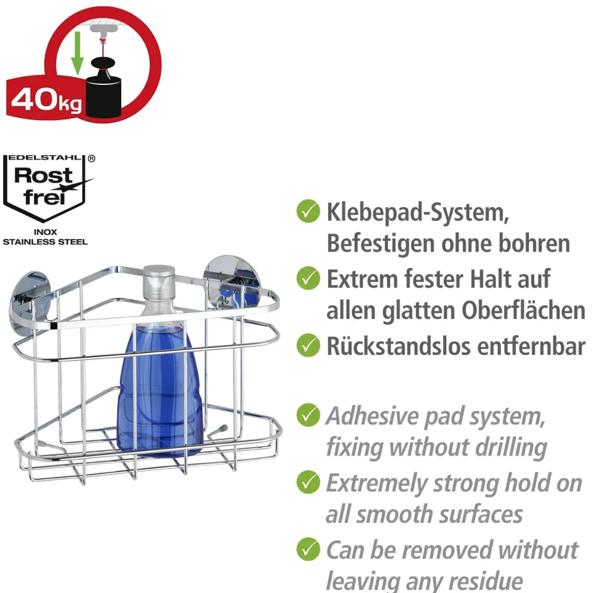 Wer auf der Suche nach einer platzsparenden Ablagemöglichkeit für sein Bad oder seine Küche ist, wird von der Wenko Turbo-Loc Eckablage begeistert sein. Mit einer max. Belastbarkeit von 40 kg bietet sie ausreichend Platz für Shampoo-Flaschen oder Gewürzgläser und dank des Materials Edelstahl rostfrei bleibt sie auch bei hoher Luftfeuchtigkeit lange Zeit schön anzusehen.