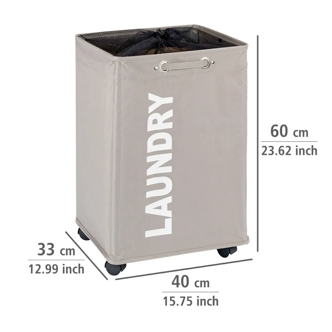 - – Material: 100 % Polyester (Wäschesammler), Polypropylen (Rollen)