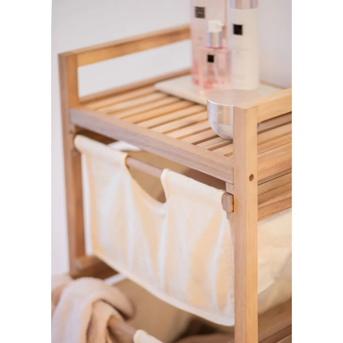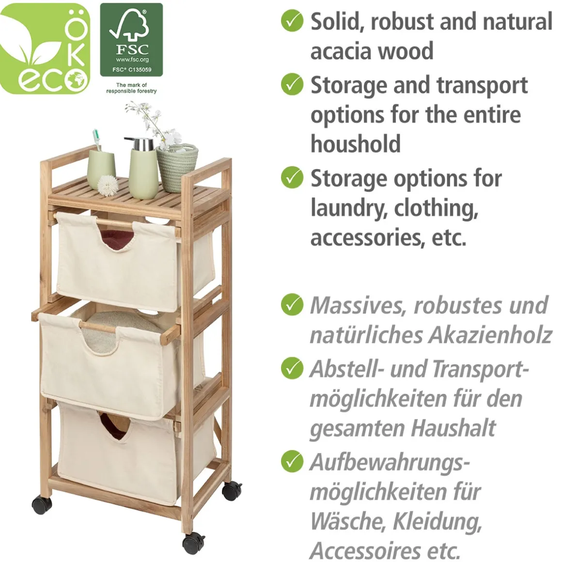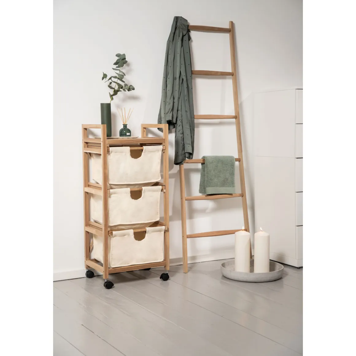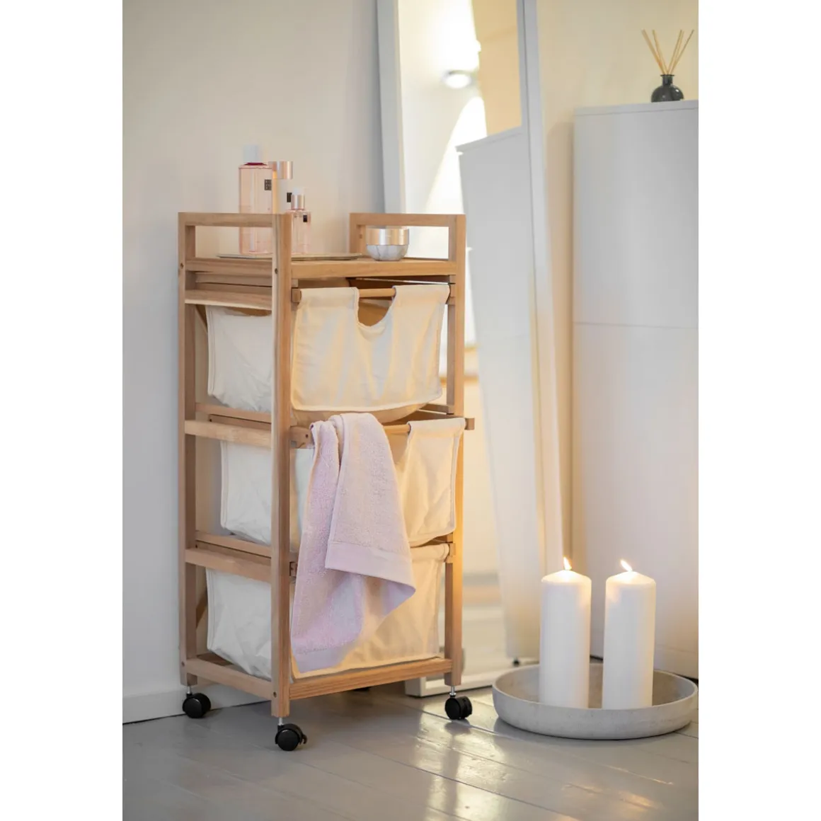 Mit dem Wenko Wäschewagen Acina wird das Sortieren und Transportieren von Schmutzwäsche zum Kinderspiel. Die drei geräumigen Schubladen aus Holz bieten viel Platz für die Trennung nach Farben oder Materialien. Dank der Rollen lässt sich der handliche Haushaltshelfer flexibel einsetzen und bei Bedarf einfach transportieren. Mit einem Gewicht von nur 5 kg ist er zudem leicht zu handhaben. Eine einfache Selbstmontage sowie die natürliche Optik machen den Acina zu einem unverzichtbaren Begleiter im Alltag.
