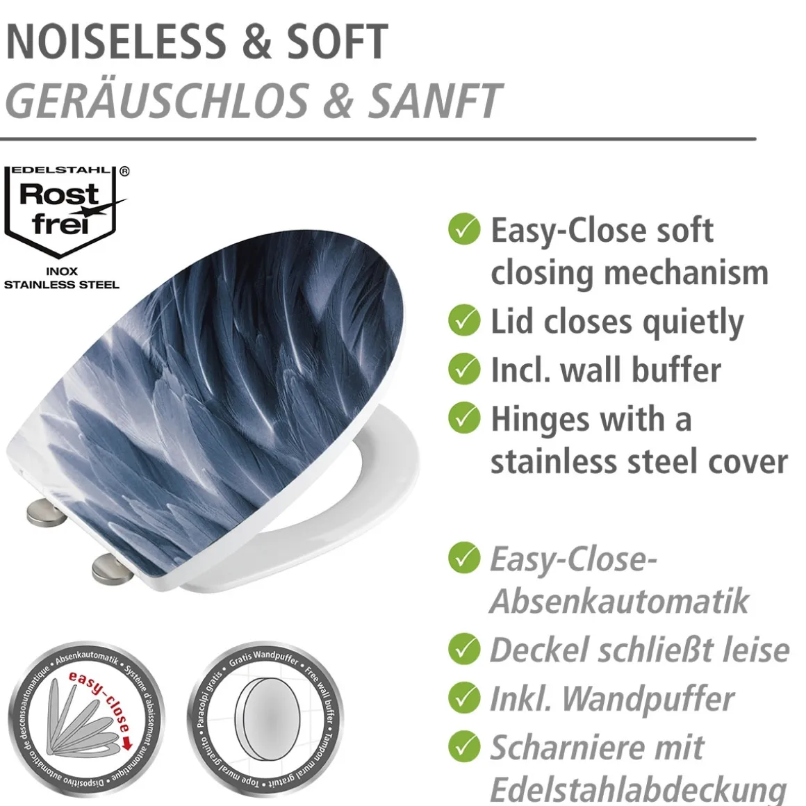 Mit dem Wenko WC-Sitz Plumes holen Sie sich einen echten Blickfang ins Badezimmer. Die Relief-Oberfläche in abstraktem Muster verleiht Ihrem Toilettenbereich das gewisse Extra. Dank Absenkautomatik und Schnellbefestigung aus bruchstabilem Thermoplast ist dieser Toilettensitz nicht nur schön anzusehen, sondern auch äußerst praktisch im Gebrauch. Überzeugen Sie sich selbst von diesem hochwertigen Produkt!