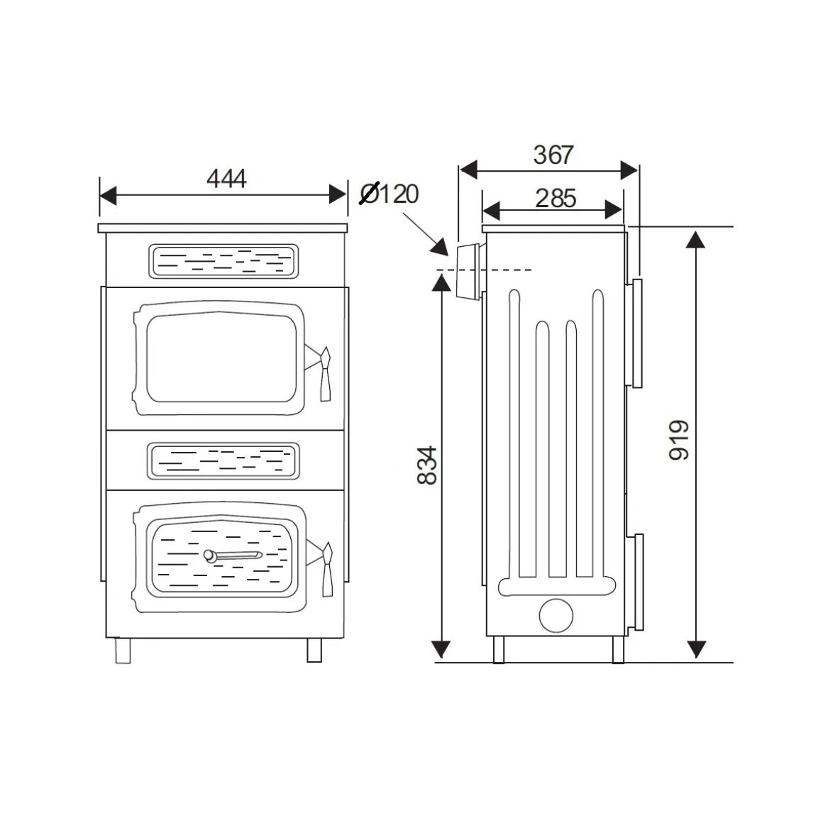 Das Modell weist eine Wärmeleistung von 8 kW auf. Damit ist er für alle Räume passend, die 182 m³ messen oder kleiner sind. Der Anschluss für das Abzugsrohr befindet sich hinten. Durch seine Maße von 44,4×91,9×36,7 cm (BxHxT) findet der Ofen überall einen Standort.