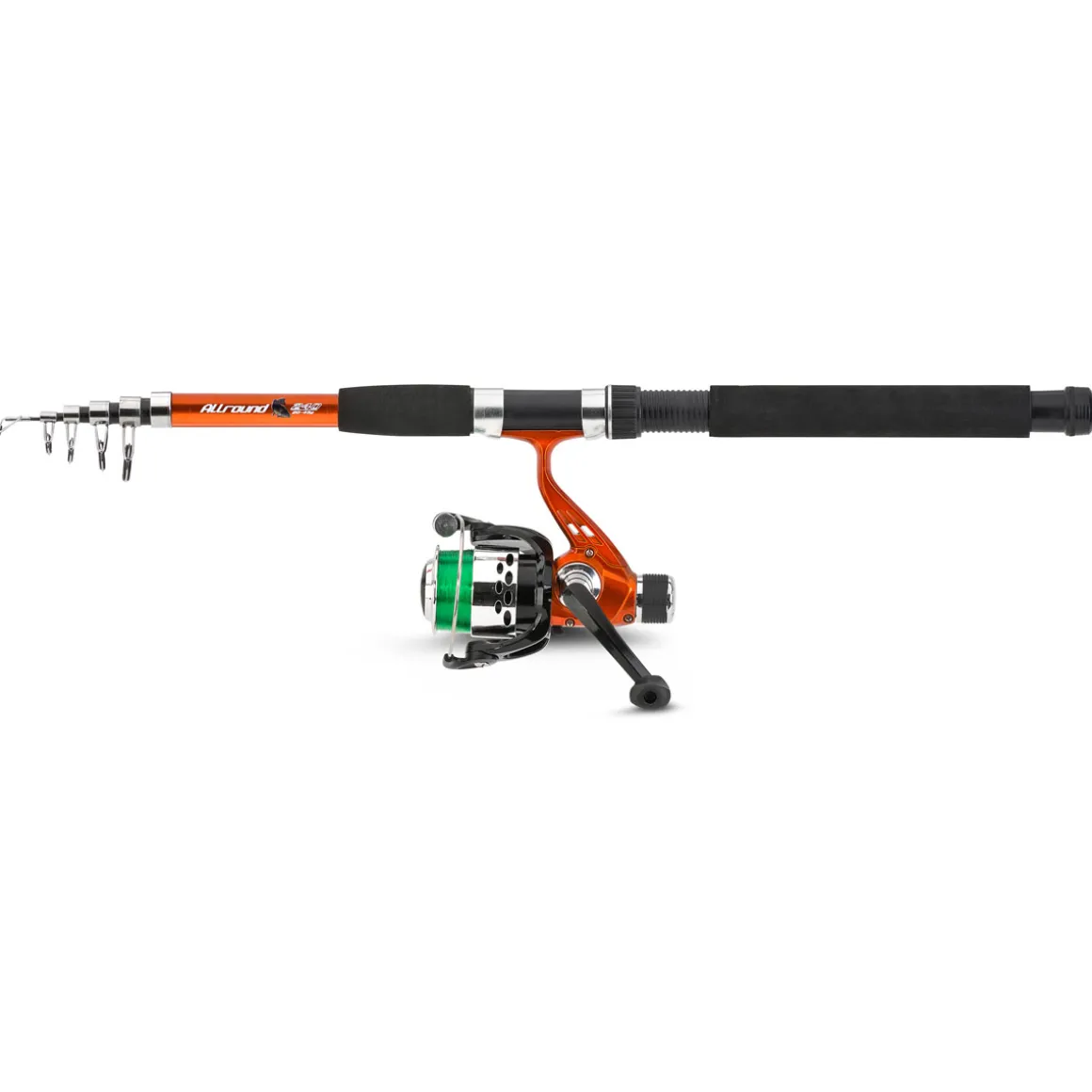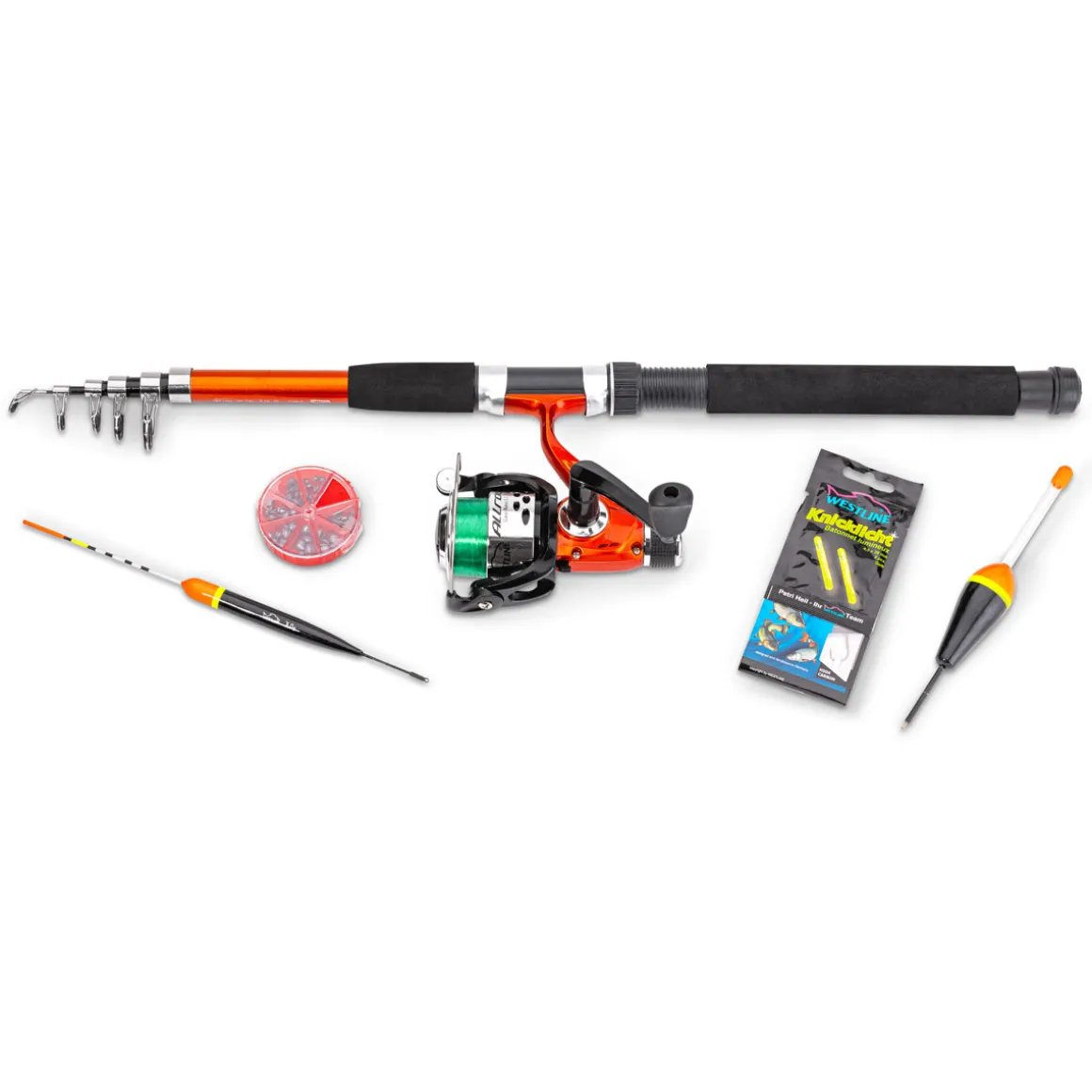 Angel-Set „Ready to fish bestehend aus Teleskoprute, 2,40 m, 650 g, Wurfgewicht 20-45 g, Rolle mit Schnur, 1 Dose mit Klemmblei und Wirbel, 1 Knicklichtpose, 2 Knicklichtern, 1 Pose und 6 Vorfachhaken, praktisches Travelset für Einsteiger und Fortgeschrittene, extrem handlich.