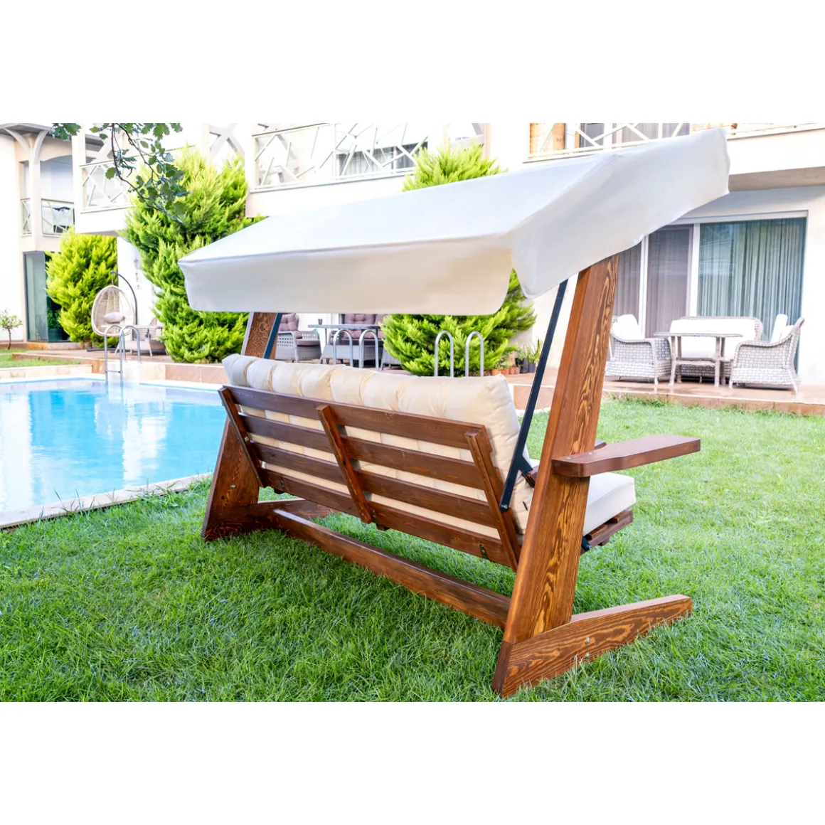 Westmann Holz Hollywoodschaukel Viva 2400 Beige 237x115x175 cm Style trifft auf einladende Gemütlichkeit: Die Westmann Hollywoodschaukel Viva 2400 ist aus robustem Massivholz gefertigt und punktet mit einer modernen Konstruktion sowie bequemen Polstern. Mit der ansprechenden Hollywoodschaukel setzt du einen gekonnten Akzent in deinem Garten! Die Highlights auf einen Blick: * Modernes Design: Optisch ansprechende & stabile Konstruktion * Nordisches Fichtenholz: Langlebig und umweltfreundlich * Langlebiger Holzschutz durch 2 Schichten Holzschutzfarbe (Tauchverfahren). * Pflegeleichter & widerstandsfähiger Stoff: Wasser- & schmutzabweisender Polyester 240 g/m² UV-Schutz 80 + * Kissenbezug und Sonnendach sind bei 30° waschbar * Robustes Hauptaufhängungs- und Trägermaterial: Metallteile sind pulverbeschichtet * Maximale Traglast von 300 kg 3 Personen * Schaukelmodul kann fixiert werden Design. Nachhaltigkeit. Qualität! Ein ansprechendes Design alleine macht noch kein perfektes Produkt — deshalb punktet die Hollywoodschaukel Viva 2400 neben der ansprechenden Optik mit weiteren Benefits: Das Holz zeichnet sich durch eine hervorragende Umweltbilanz sowie beeindruckende Langlebigkeit aus. Der Polyesterstoff ist wasser- sowie schmutzabweisend und bietet mit einem UV-Schutzfaktor von 80 + ausreichend Schutz vor schädlichen UV-Strahlen. Dank der zweifachen Schicht Holzschutzfarbe auf Wasserbasis ist das Holz zusätzlich vor Witterungseinflüssen geschützt. Dein neuer Lieblingsplatz im Freien! Nimm Platz auf deinem neuen Lieblingsmöbel, schließ die Augen und lass dich sanft hin- und herschaukeln. Mit der Hollywoodschaukel Viva 2400 von Westmann wertest du deinen Garten auf und kannst gleichzeitig entspannte Stunden im Freien genießen!