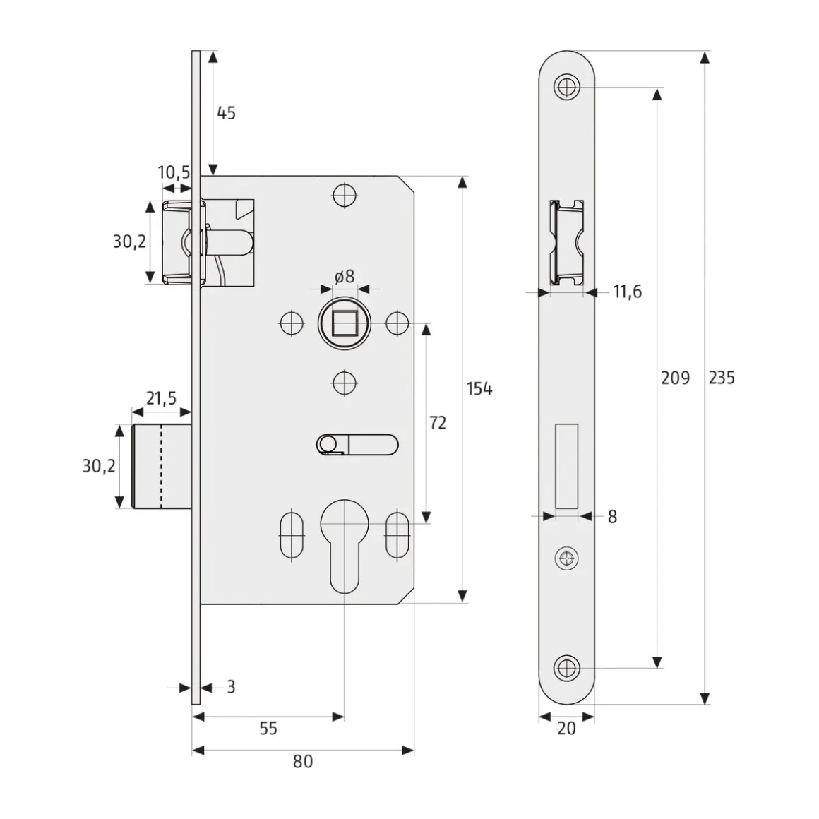 - – Ausführung: Durch Verschließen des Türzylinders wird der Riegel aktiviert; Dornmaß von 55 mm; WC-Funktion