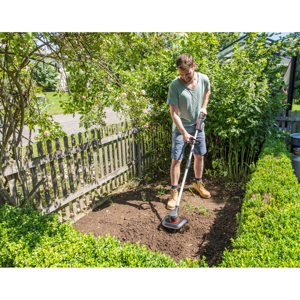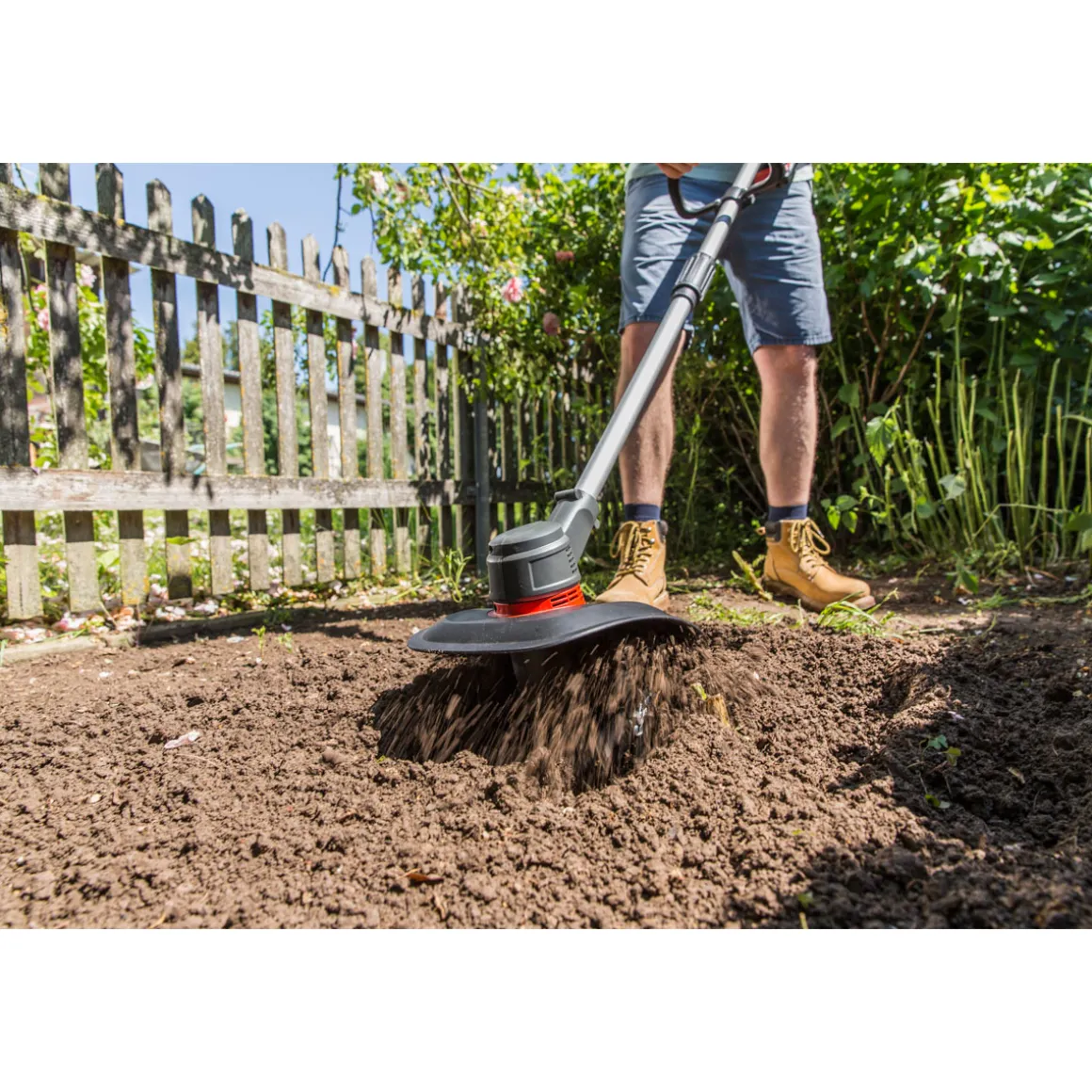 - Lieferumfang: Bodenhacke, Akku, Ladegerät