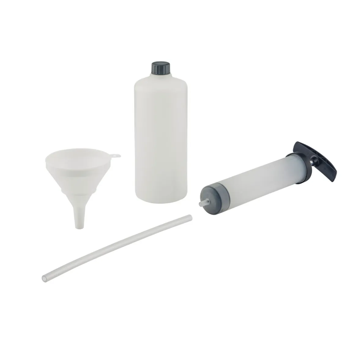 - Das Set enthält eine Absaugpumpe, einen Behälter und einen Trichter.
