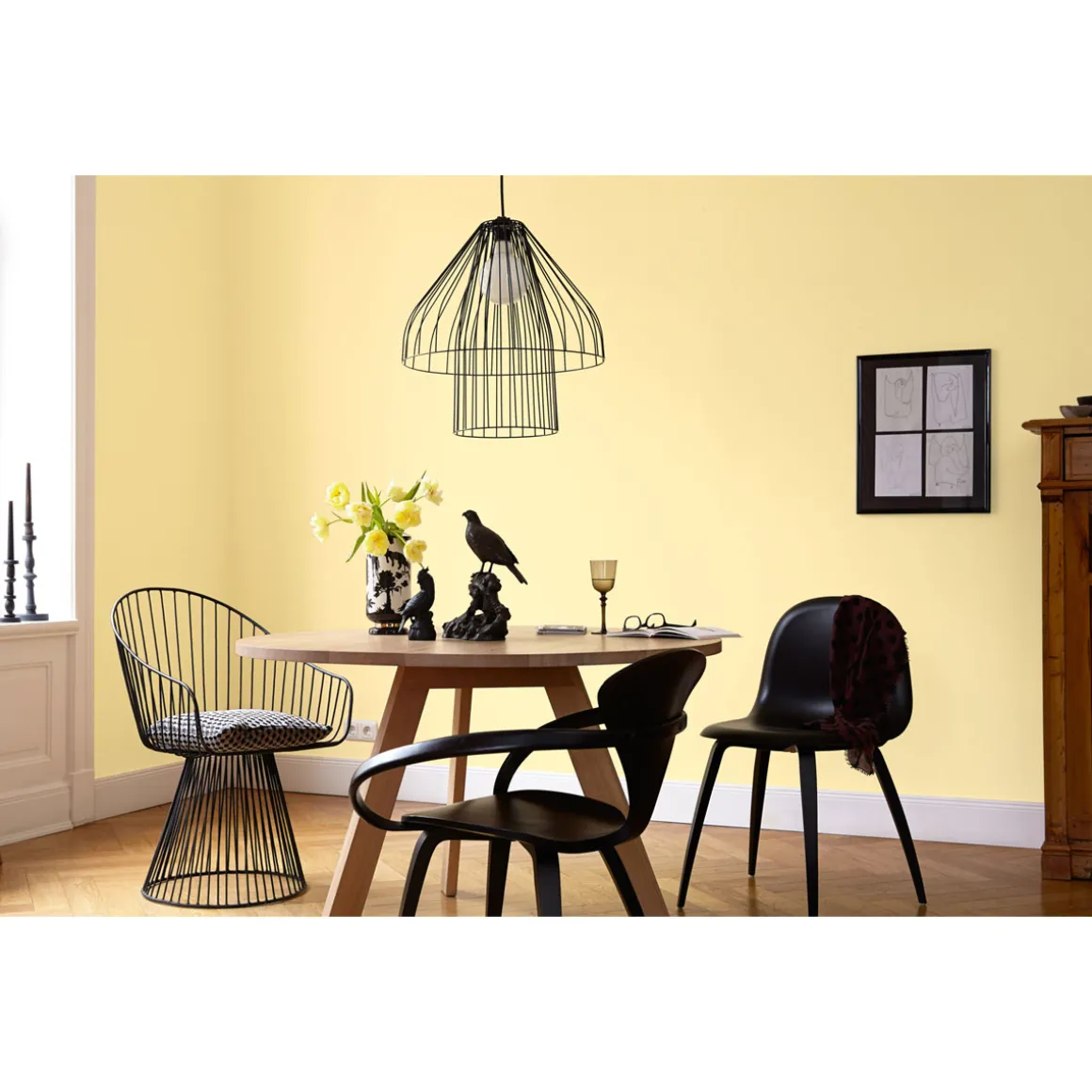 Die hochwertige Innenfarbe von Alpina überzeugt durch ihre zurückhaltende Pastellgelb-Nuance sowie ihre strapazierfähigen Eigenschaften. Mit einer Nassabriebbeständigkeit der Klasse 3 nach DIN EN 13300 ist sie besonders waschbeständig und somit perfekt geeignet für stark beanspruchte Räume wie Küche oder Kinderzimmer. Auch in puncto Gesundheit punktet die Wandfarbe durch ihre konservierungsmittelfreie Zusammensetzung sowie ihre Lösemittelfreiheit. Dank ihrer Ergiebigkeit von bis zu 30 m² pro Gebinde sind auch größere Flächen schnell gestrichen.