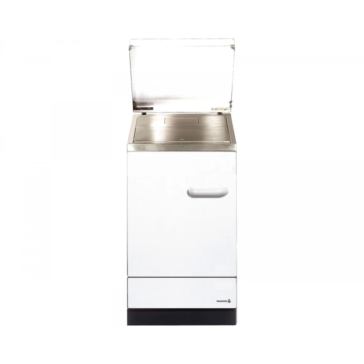 Der Wamsler Beistellherd „K 155 S“ verfügt über eine Leistung von 5.000 Watt und wird inklusive Schürhaken, Deckelheber und Stahlplatte als Abdeckung geliefert.Der Beistellherd „K 155 S“ ist ein Dauerbrandofen mit Edelstahlrahmen, Edelstahlverkleidung in Weiß sowie einer geschliffenen Stahlplatte. Das Gewicht dieses Modells liegt bei 115 kg, die Maße bei 500×850(+50)x600 mm. Der Beistellherd ist aufgrund verstellbarer Schraubfüße in der Höhe variabel und verfügt über einen ebenfalls verstellbaren Rost. Als Brennstoffe eignen sich Scheitholz sowie Holz- und Braunkohlebriketts. Anschlüsse mit einem Durchmesser von 120 mm befinden sich oben und hinten sowie auf beiden Seiten. Das maximale Raumheizvermögen des Ofens liegt bei 124 m³, der Abgasmassenstrom beträgt 6,6 g/s und der notwendige Förderdruck bei NWL beläuft sich auf 12 Pa. Ein Mindestabstand zu brennbaren Bauteilen ist unbedingt einzuhalten. Dieser liegt seitlich bei 200 mm und nach hinten bei 400 mm. Der Feuerraum dieses Modells hat eine Größe von 190×210 mm, die Heiztüröffnung ist 193×123 mm groß und die Herdplatte hat ein Maß von 442×543 mm. Zur weiteren Ausstattung des Ofens gehören ein geräumiger Aschekasten sowie eine großzügige Brennstofflade, in welcher sich Briketts und Holzscheite unterbringen lassen. Die Abgastemperatur am Abgasstutzen liegt bei 311 °C. Der Beistellherd „K 155 S“ lässt sich, dank verstellbarem Rost, sowohl im Sommer als auch im Winter betreiben und eignet sich für eine Befeuerung mit Holz- und Braunkohlebriketts sowie Holzscheiten.