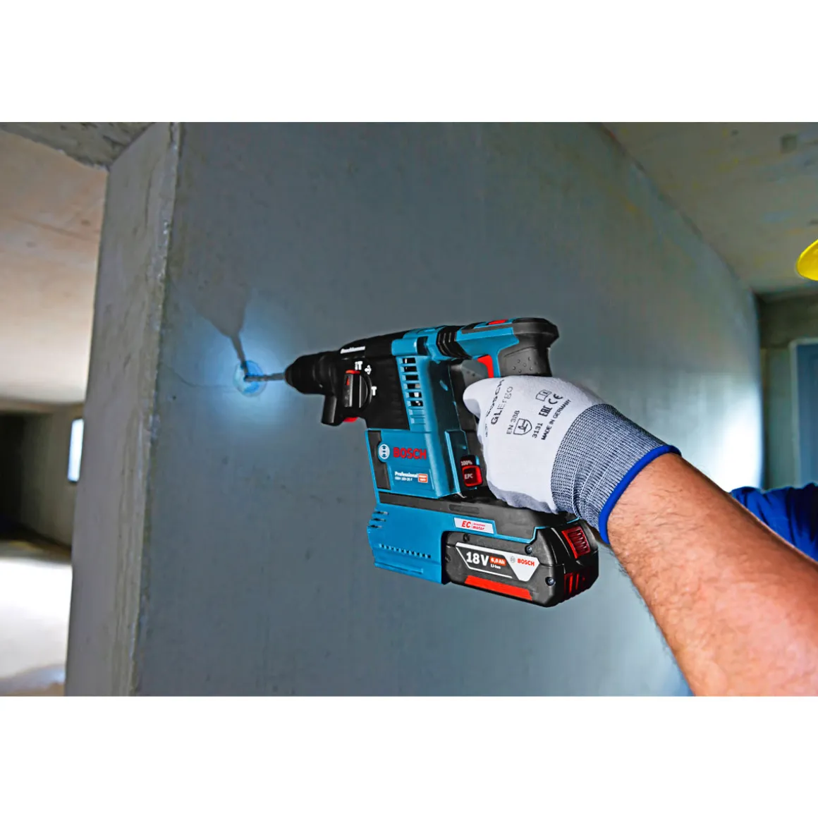 Der Bosch Professional Akku Bohrhammer GBH 18V -26F bietet Ihnen Flexibilität beim Arbeiten durch seine kabellose Freiheit sowie eine hohe Leistungsfähigkeit dank seiner hohen Schlagzahl von bis zu 4.350 /min und seiner maximalen Einzelschlagenergie von 2,6 J . Die integrierte Arbeitsleuchte sorgt zudem dafür dass Sie auch bei schlechten Lichtverhältnissen immer alles im Blick haben.