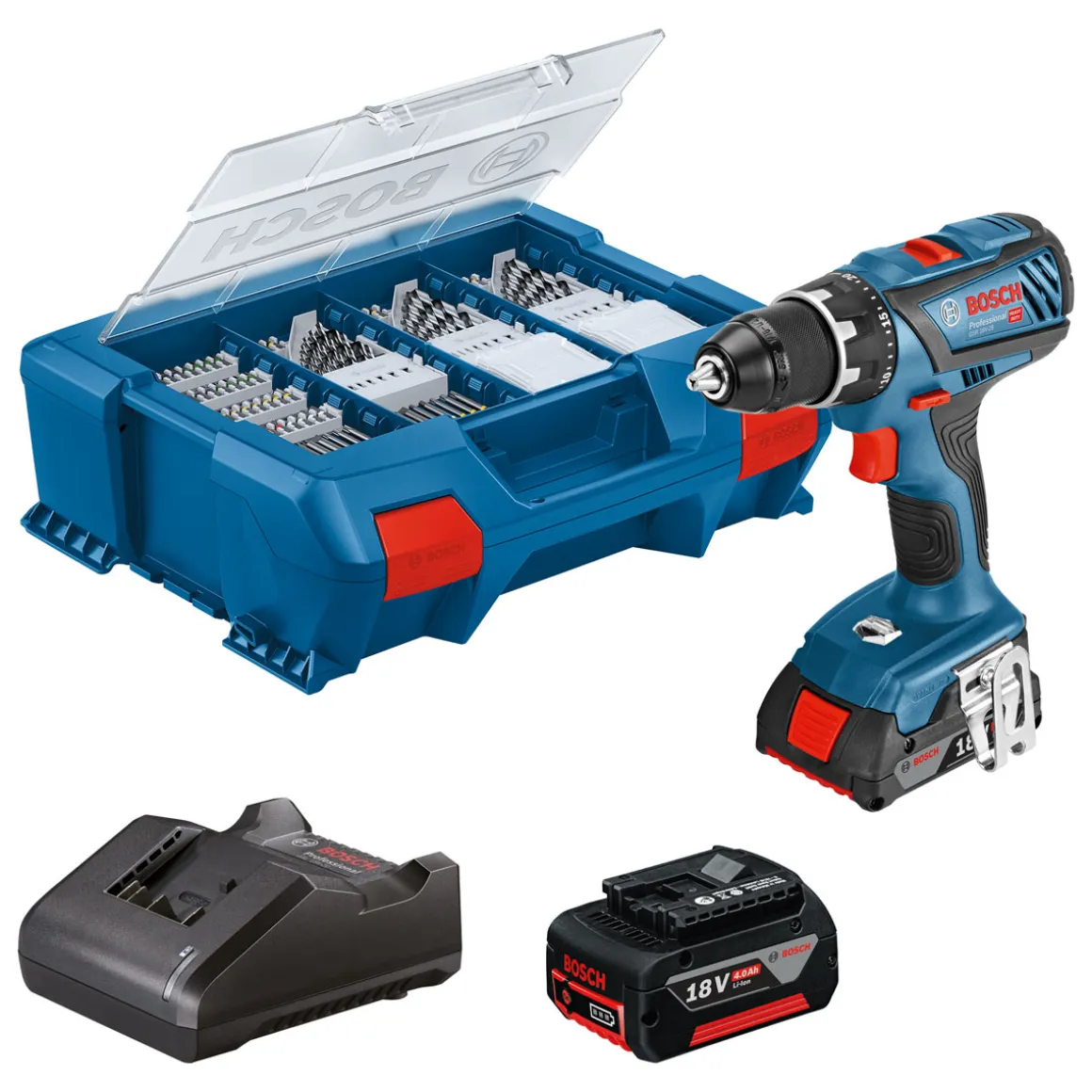 - – Lieferumfang: 1x Akku-Bohrschrauber, 1x Akku mit einer Kapazität von 2Ah, 1x Akku mit einer Kapazität von 4Ah; 1x Ladegerät GAL 18V-20, 1x 82-teiliger Zubehör-Koffer