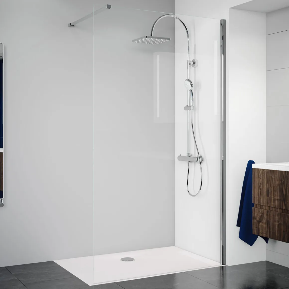 Die alleinstehende Duschwand eignet sich perfekt für Kunden, die auf der Suche nach einer modernen und stilvollen Lösung für ihr Badezimmer sind. Besonders geeignet ist sie für Kunden, die eine offene Walk-In-Lösung bevorzugen.