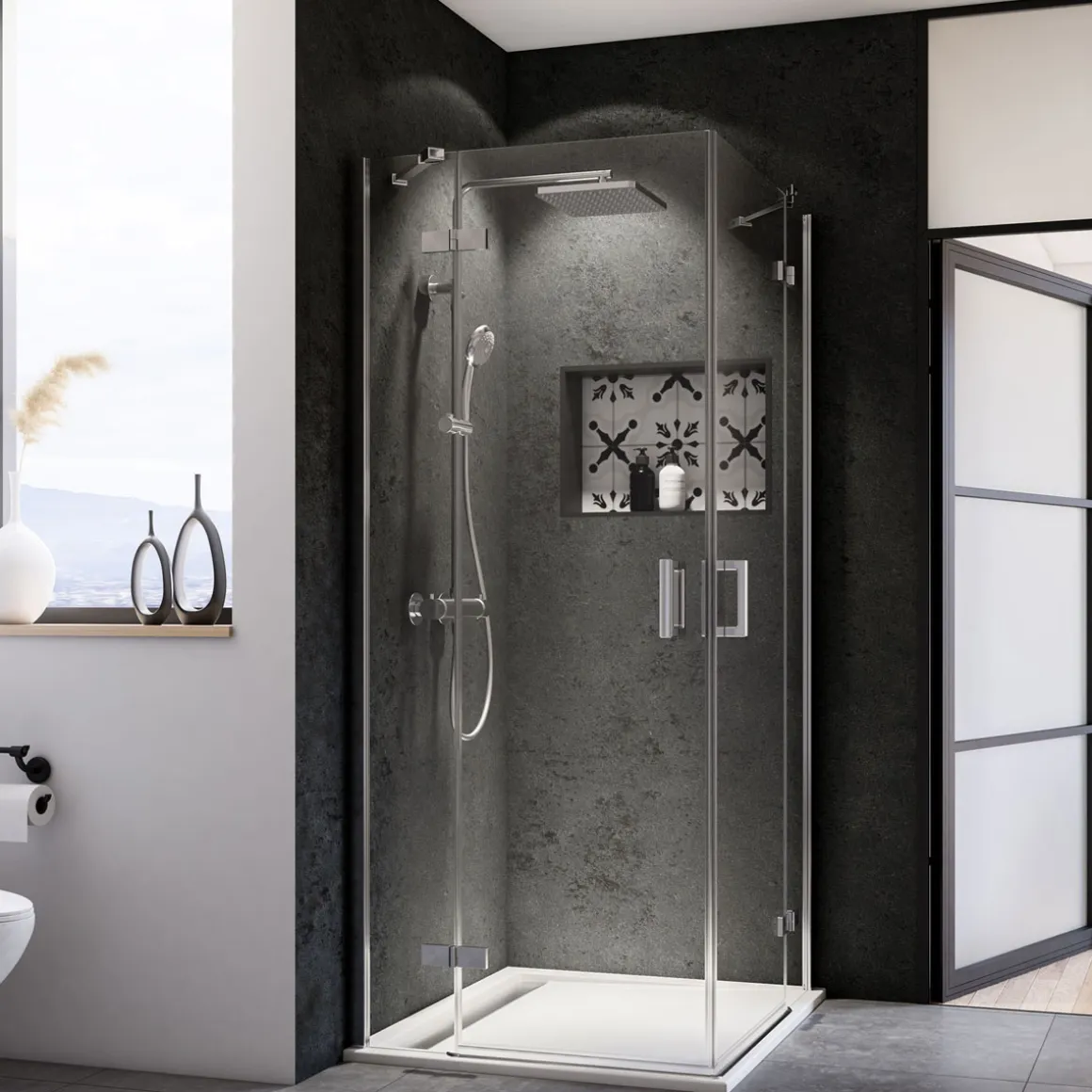 Breuer Eckeinstieg Panorama Drehtür 4-teilig, schwarz matt, Klarglas, 1000/1000 mm