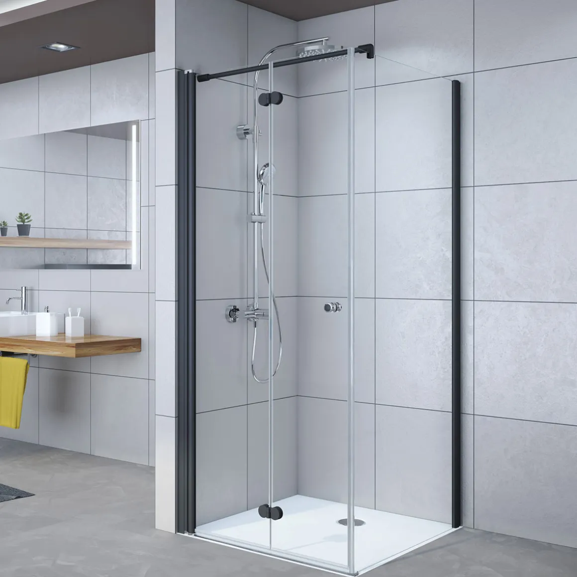 Erleben Sie mit der Breuer Seitenwand Elana Komfort Drehfalttür ein neues Duschgefühl. Die hochwertige Türlösung in elegantem Schwarz und grau getöntem Glas verleiht Ihrem Badezimmer eine moderne Note. Mit ihrem praktischen Hebe-/Senkmechanismus lässt sich die Tür mühelos öffnen und schließen.