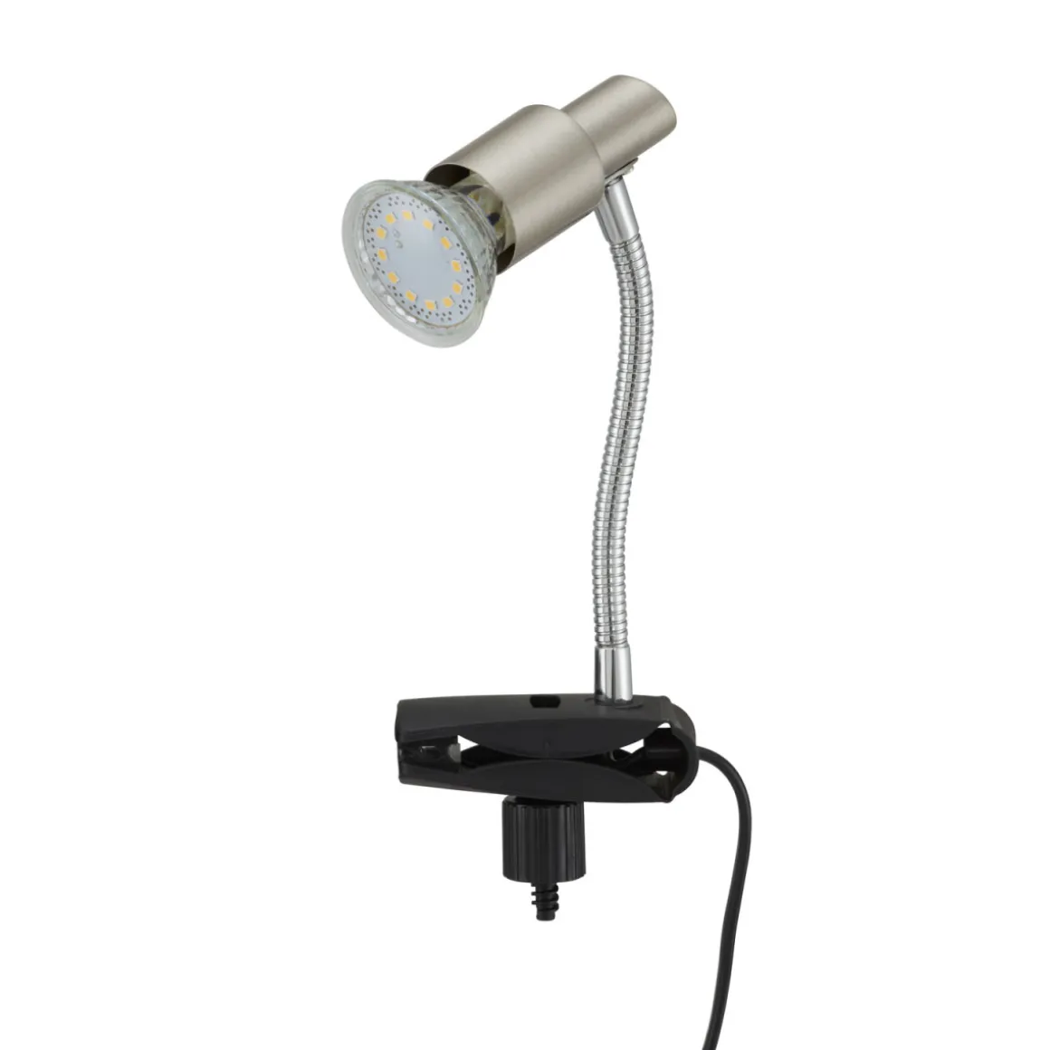 - Die Klemmleuchte hat eine Grundfarbe von Silber und ist mit einer warmweißen LED ausgestattet.