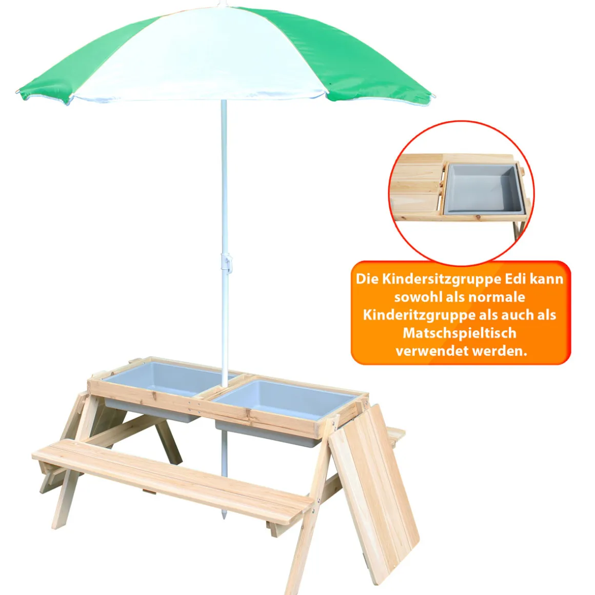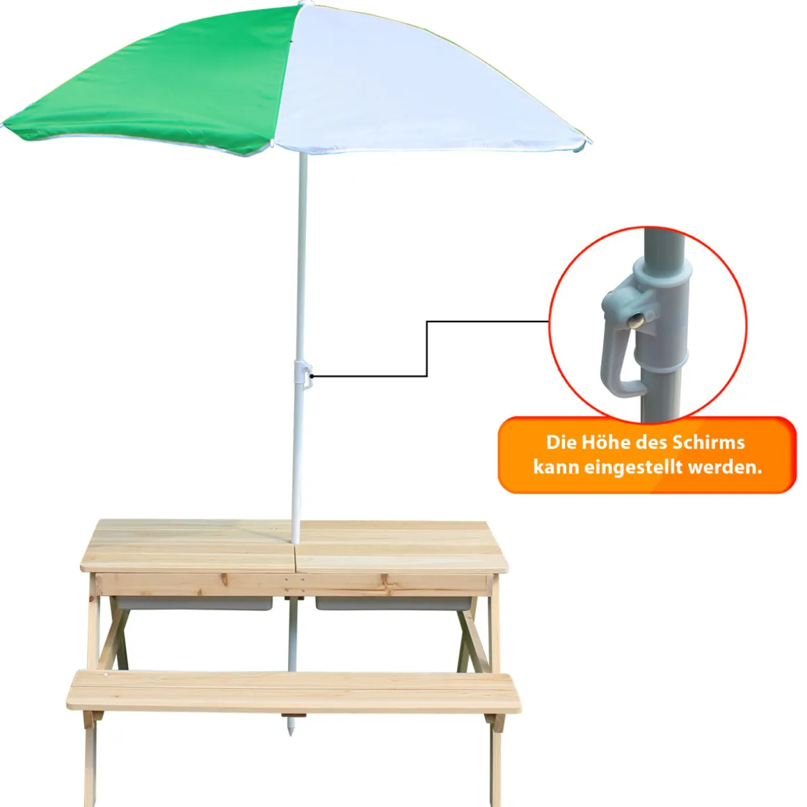 Mit diesem tollen Picknicktisch-Set mit Wasserbecken und Sonnenschirm kann Ihr Kind und seine Freunde viele schöne Nachmittage verbringen. Das Gartenset ist perfekt für Picknicks, zum Sand- und Wasser-Spielen oder für Besuch auch an sonnigen Tagen. Der Picknicktisch und die Bank aus massivem Holz sind äußerst robust und langlebig, aber dennoch leicht. Die Bänke und der Tisch haben genau die richtige Größe für Kinder. Unter der abnehmbare Tischplatte kommen zwei Wannen aus Kunststoff zum Vorschein. Es ist der ideale Platz für Kinder, um mit Sand, Wasser und Naturmaterialien ihre Umwelt zu entdecken. Freunde und Spielzeuge sind ebenfalls willkommen. Dank des verstellbaren großen Sonnenschirms, der an heißen Tagen wohltuenden Schatten spendet, sind Kinder vor direkter Sonneneinstrahlung geschützt. Der Sonnenschirm ist abnehmbar. Dieses Set ist aus wetterfestem Holz mit einer schönen Lasur gefertigt und sieht jahrelang gut aus. Ohne Dekoration.