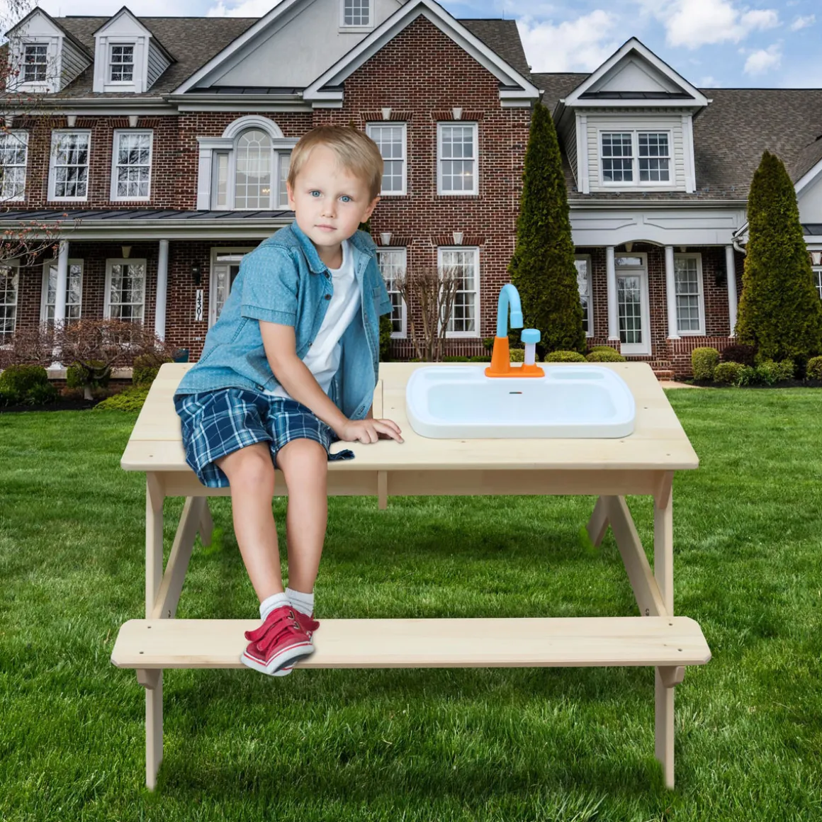 Die Kindersitzgarnitur mit Spielwanne und Wasserhahn ist aus hochwertigem, robustem Massivholz produziert. Die gelungene Kombination aus Sitzgarnitur und Matschtisch bietet Gartenspaß für Jungs und Mädchen. Der multifunktionale Sand- und Wasserspieltisch dient als Sitzgarnitur zum Picknicken und dank abnehmbarer Tischplatte auch als Spieltisch für Sand, Wasser und Matsch. Die fest verschraubten Sitzbänke bieten komfortablen und sicheren Sitz für Kinder. Die Tischplatte der Sitzgruppe ist halbseitig abnehmbar. Darunter verbirgt sich eine Wasserwanne aus robustem Kunststoff. Ihre Kinder können mit Wasser spielen und Sandburgen bauen. Besonders originell: der Wasserhahn ist mit einem Wassertank unterhalb der Tischplatte verbunden. So kann Wasser in das Waschbecken gepumpt werden.