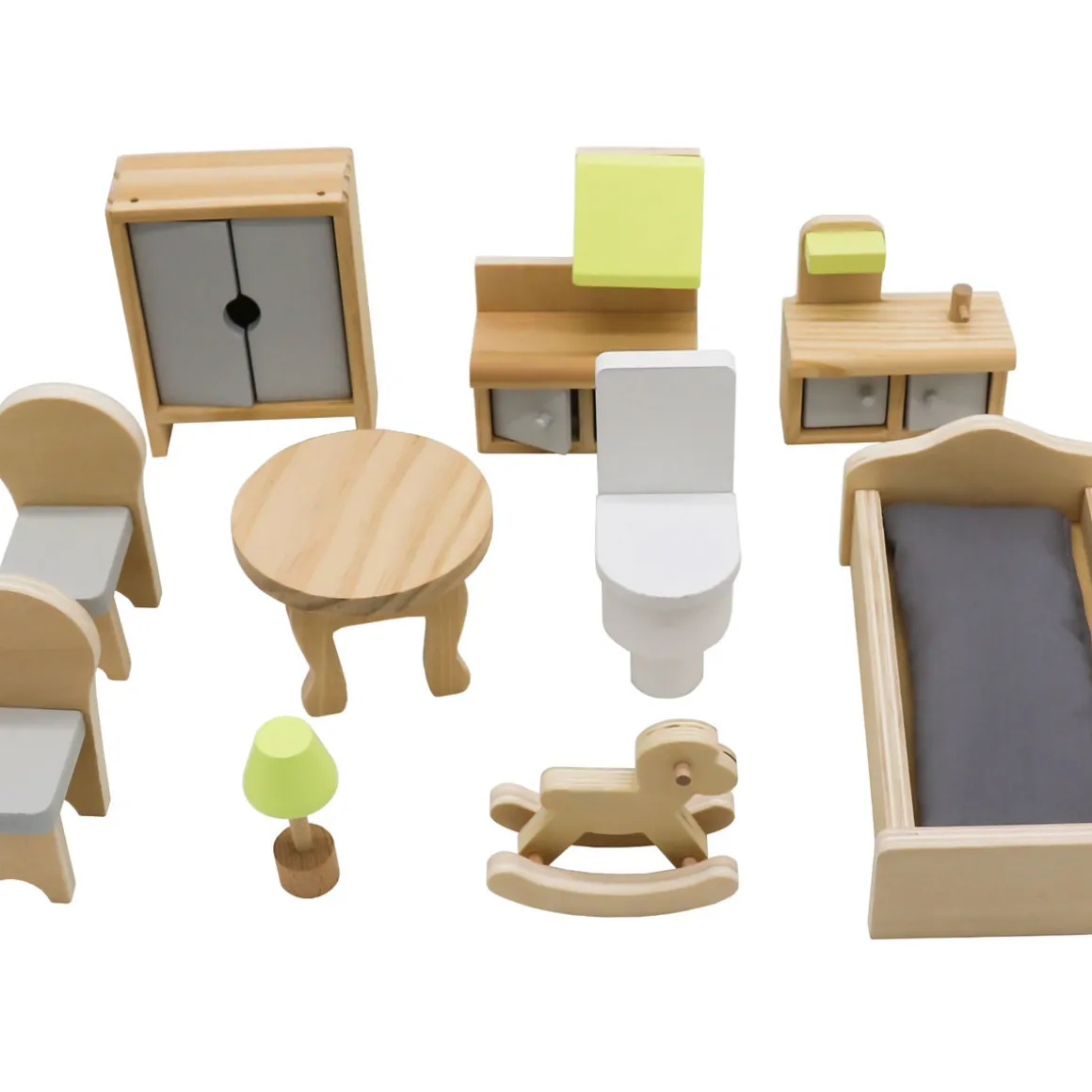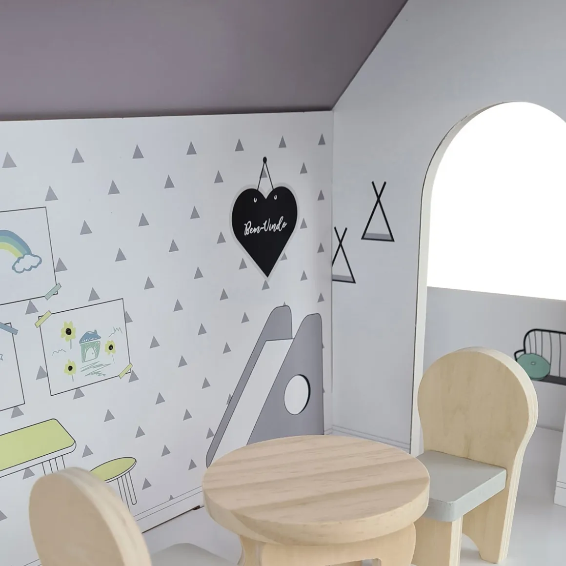 | Ausstattung: | Wohnzimmer (Schrank, Tisch, Stühle) Schlaf- Kinderzimmer (Bett, Lampe, Schaukelpferd) Badezimmer (Toilette) Küche (Herd mit Dunstabzugshaube, Spülbecken) stabile Ständerkonstruktion mit großen Spielöffnungen, Material MDF Aufbauanleit |