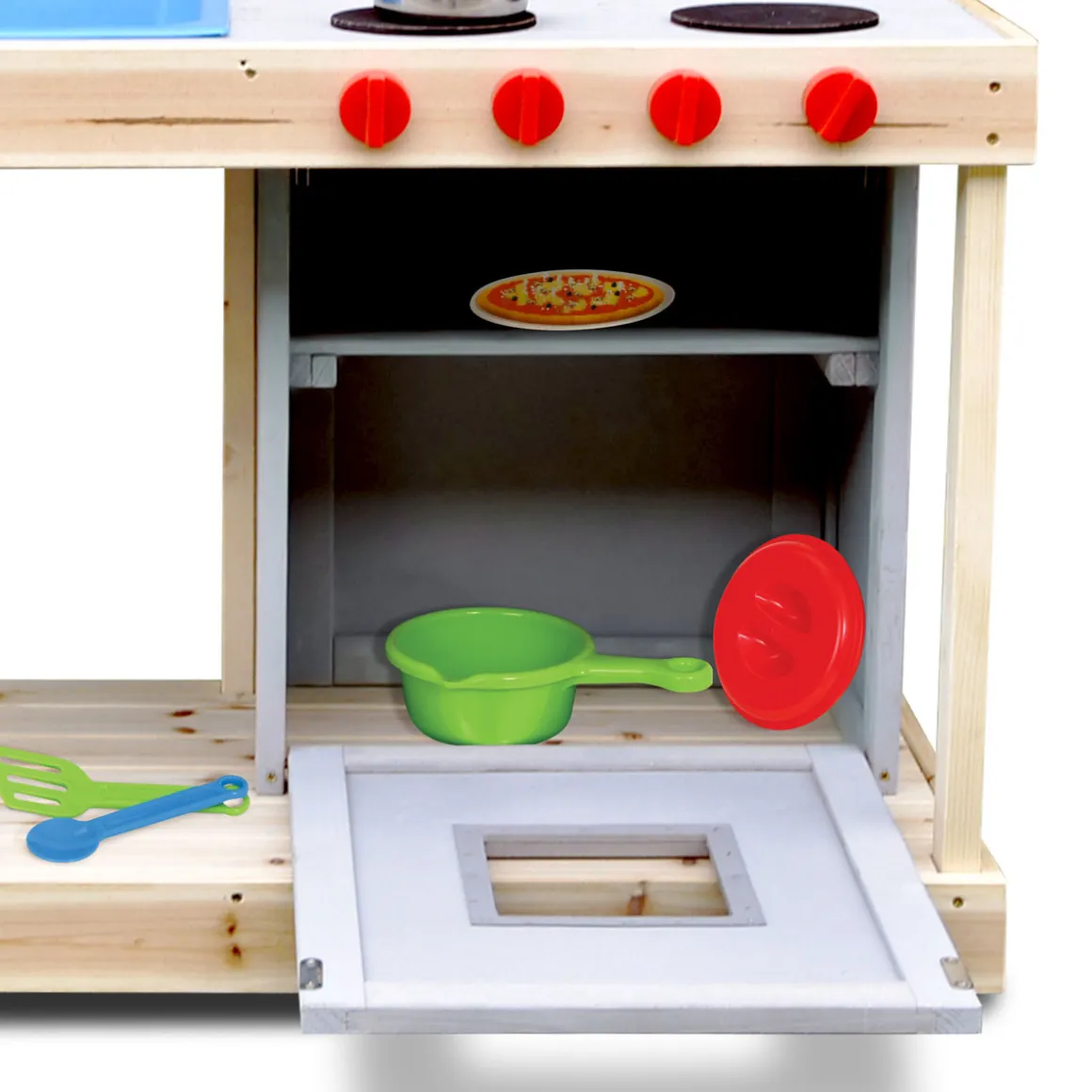 Die stabile Kinderküche verfügt über ein großes Spülbecken mit Wasserhahn, in dem mit den unterschiedlichsten Materialien experimentiert werden kann. Im Backofen können die herrlichsten Gerichte zubereitet werden. Für Utensilien wie Eimer, Töpfe oder Förmchen gibt es genügend Stauraum unter der Spüle. Über die gesamte Breite der Matschküche verläuft ein Ober-Board für weitere Staufläche.