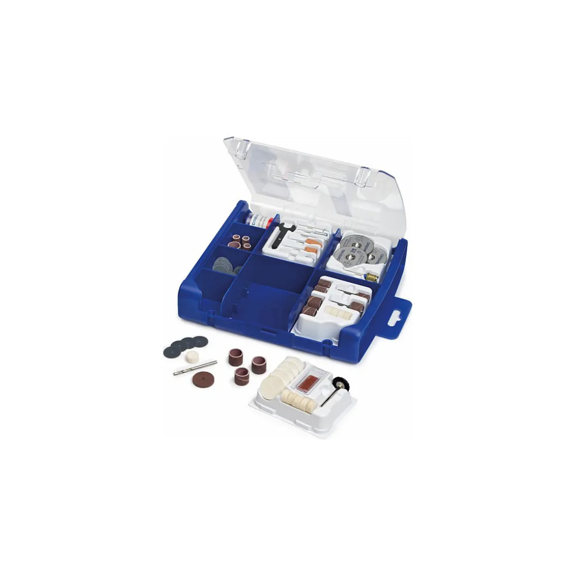Mit dem Dremel Zubehör-Set 100-teilig haben Sie alle Werkzeuge zur Hand, die Sie für Bohren, Bürsten, Trennen, Schleifen, Fräsen und vieles mehr benötigen. Der transparente Aufbewahrungs- und Tragekoffer sorgt dafür, dass das Zubehör immer griffbereit ist.
