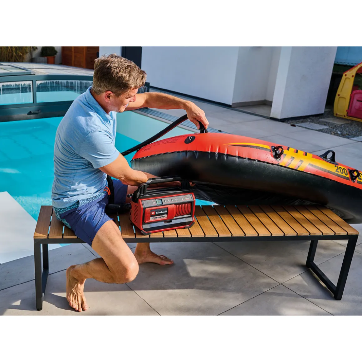 - Leistungsstarke Hochdruckpumpe mit bis zu 11 bar Druck für schnelles Aufpumpen von Reifen und Bällen