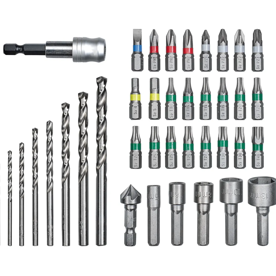 - Lieferumfang: 24 Bits, 8 HSS-Metallbohrer, 5 Steckschlüsseleinsätze, 1 Senker, 1 Schnellwechselbithalter, Aufbewahrungsbox