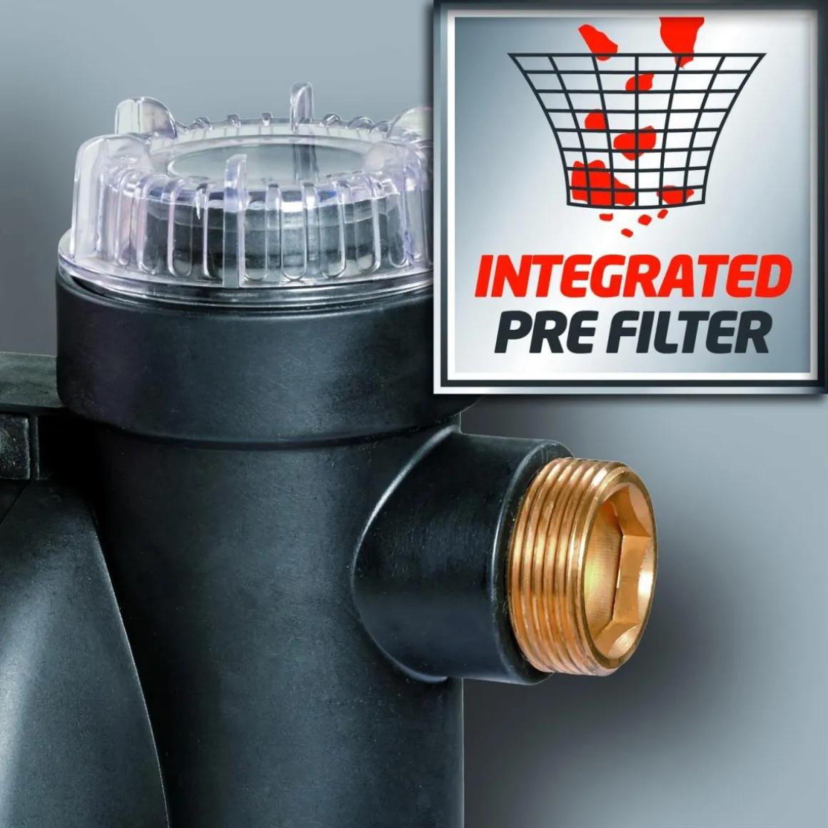 - Inklusive großer Wassereinfüllöffnung, Vorfilter, Trockenlaufschutz, Wasserablassschraube sowie Saug- und Druckanschluss