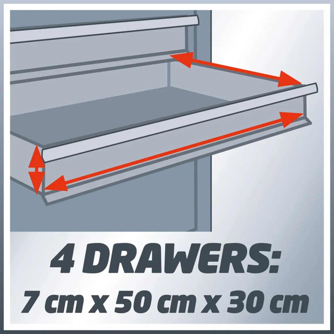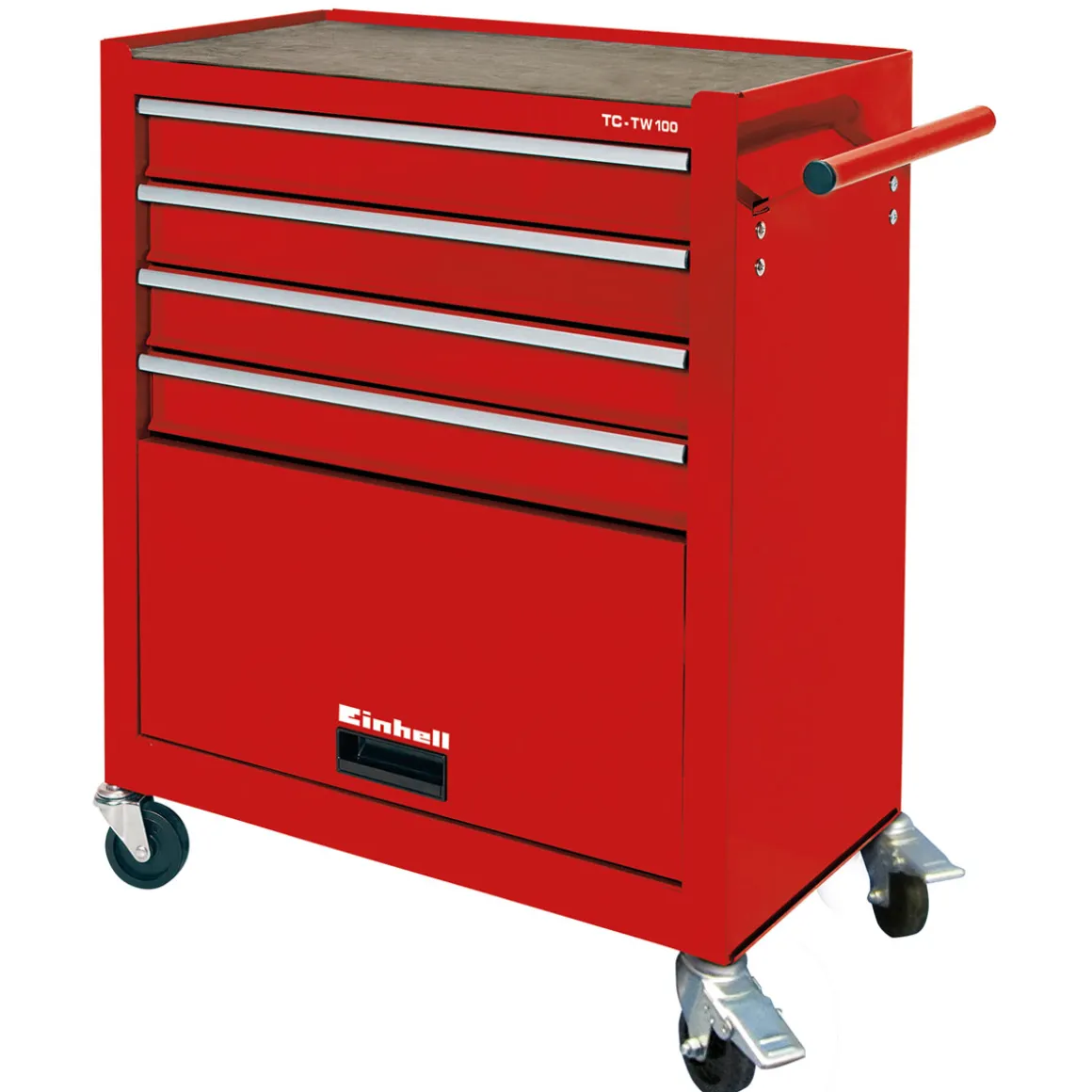 Der Einhell Werkstattwagen TC-TW 100 ist der ideale Helfer für alle Heimwerker und Profis. Mit seinen vier leichtgängigen Schubladen und einer Ablagefläche mit Auflagematte bietet er ausreichend Platz für Ihr Werkzeug. Die drehbaren Rollen aus Kunststoff, davon zwei mit Festellbremse, sorgen für eine einfache Fortbewegung des Wagens.