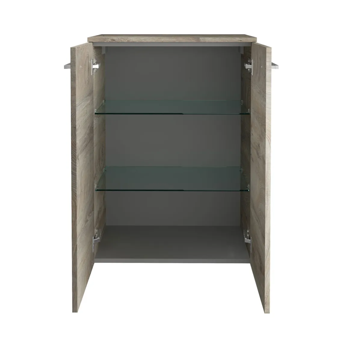 - – Ausstattung: 2 Türen, 2 Glaseinlegeböden, Querteile + Rückwand silbergrau