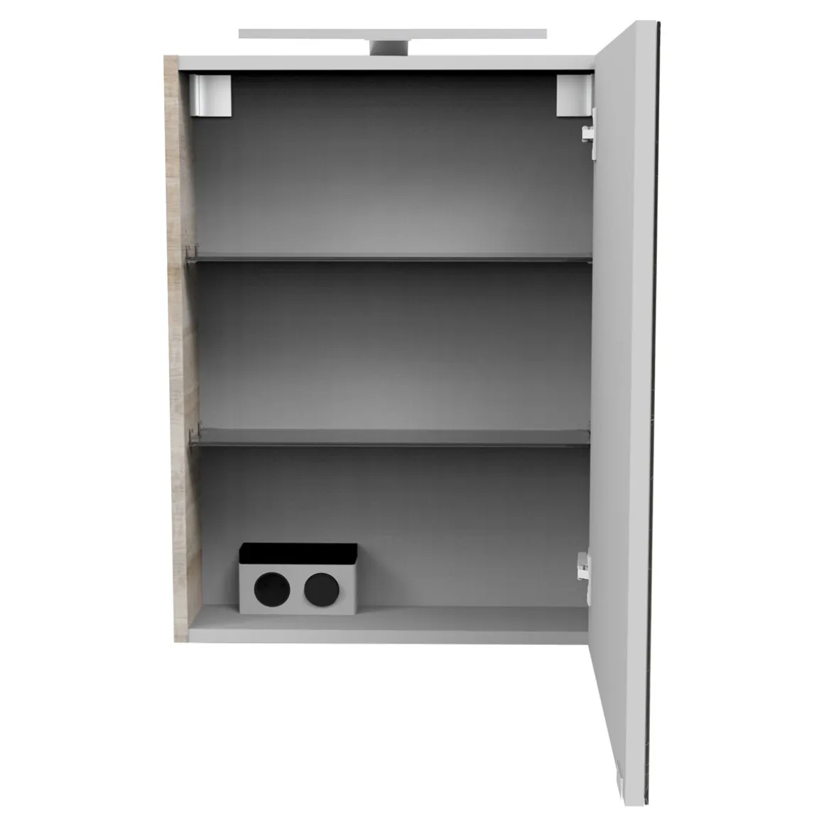- – Ausstattung: Einlegeböden (2 Stück), Lichtschalter innen, Steckdose innen (1 Stück)