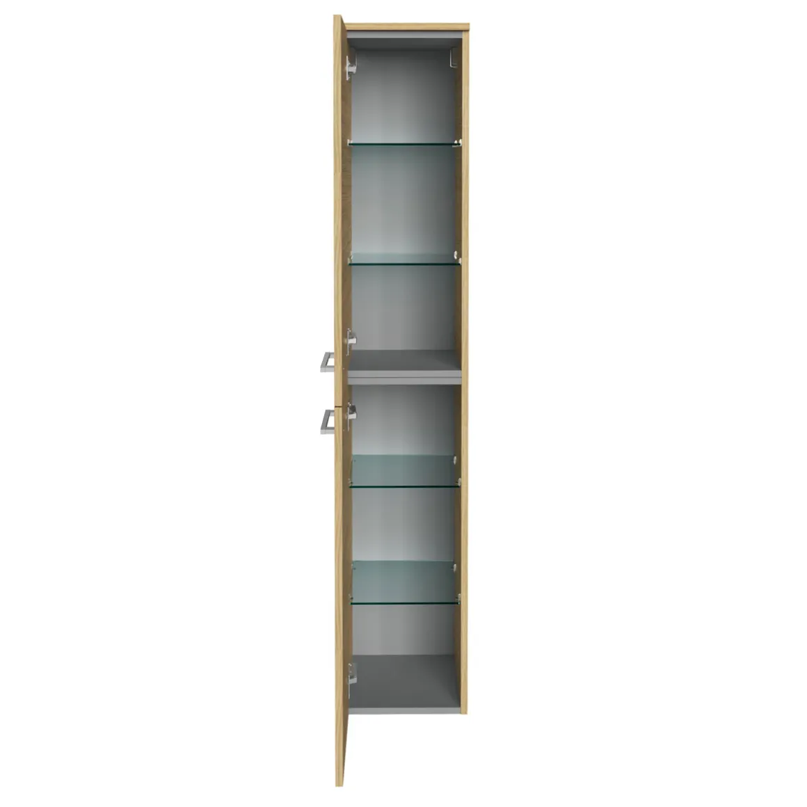 - Praktische Ausstattung: Der Schrank verfügt über zwei Türen mit Türdämpfern sowie vier Glaseinlegeböden. Die Querteile und Rückwand sind silbergrau gehalten.
