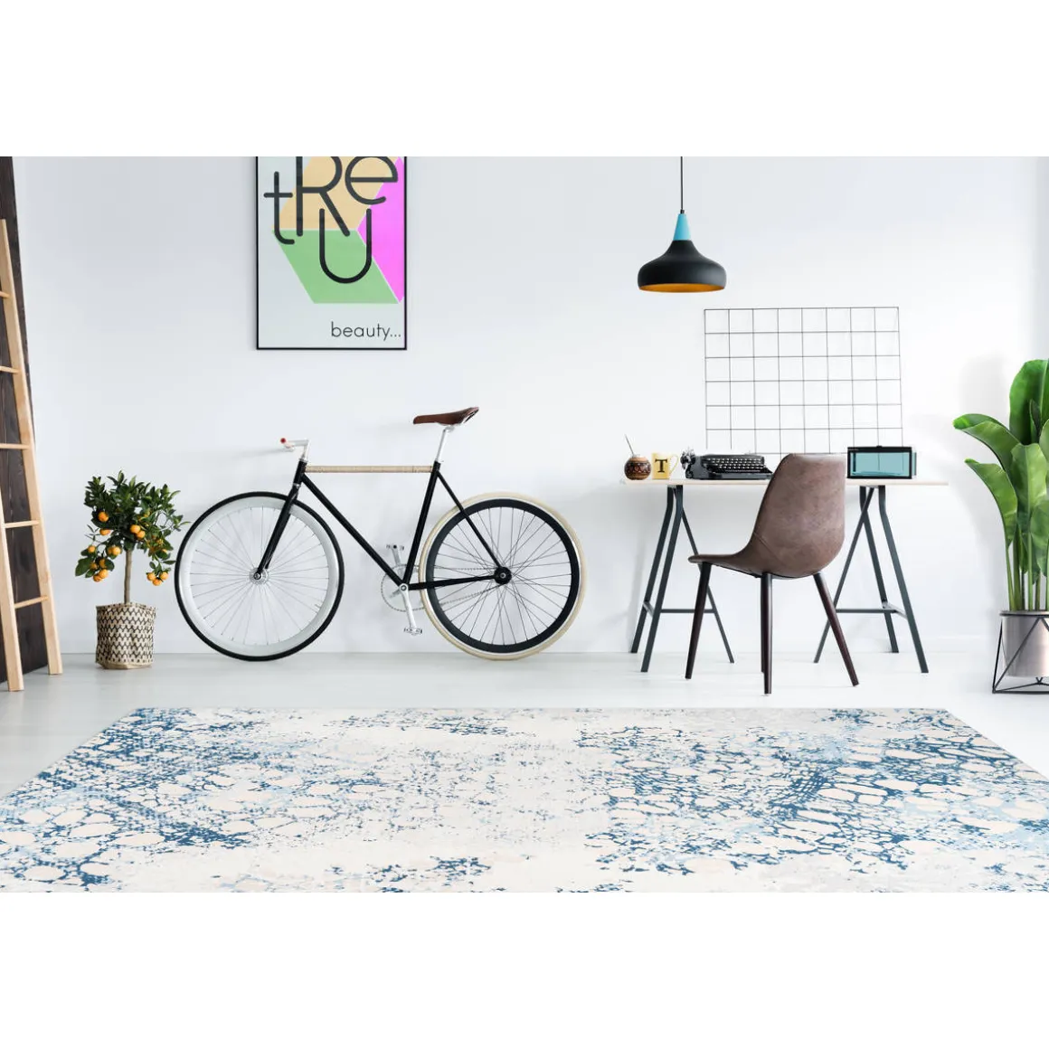 - Die Grundfarbe des Teppichs strahlt in einem eleganten Creme-Ton mit stilvollen blauen Akzenten