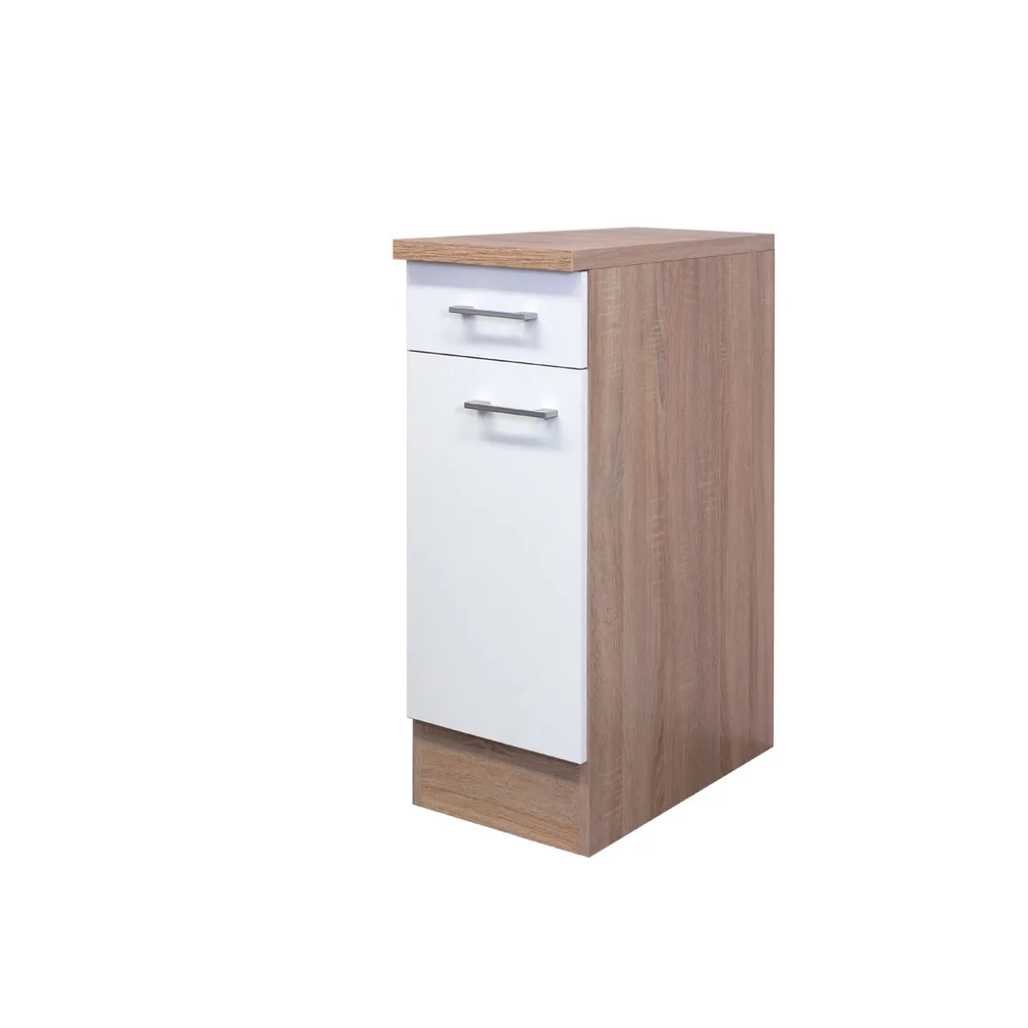 Der Flex-Well Küchenunterschrank Samoa ist die perfekte Ergänzung für Ihre Küche! Mit seiner zeitlosen Kombination aus weißer Front und Sonoma Eiche Nachbildung bringt er eine moderne, aber gemütliche Atmosphäre in Ihren Raum. Die mattierte Oberfläche sorgt für ein elegantes Finish, während die kompakte Größe von 30x85x60 cm optimalen Stauraum bietet, ohne viel Platz einzunehmen. Dieser Unterschrank überzeugt nicht nur durch sein Design, sondern auch durch seine praktische Ausstattung – eine Schublade und eine Drehtür bieten Ihnen vielseitige Möglichkeiten zur Organisation Ihrer Küchenutensilien.